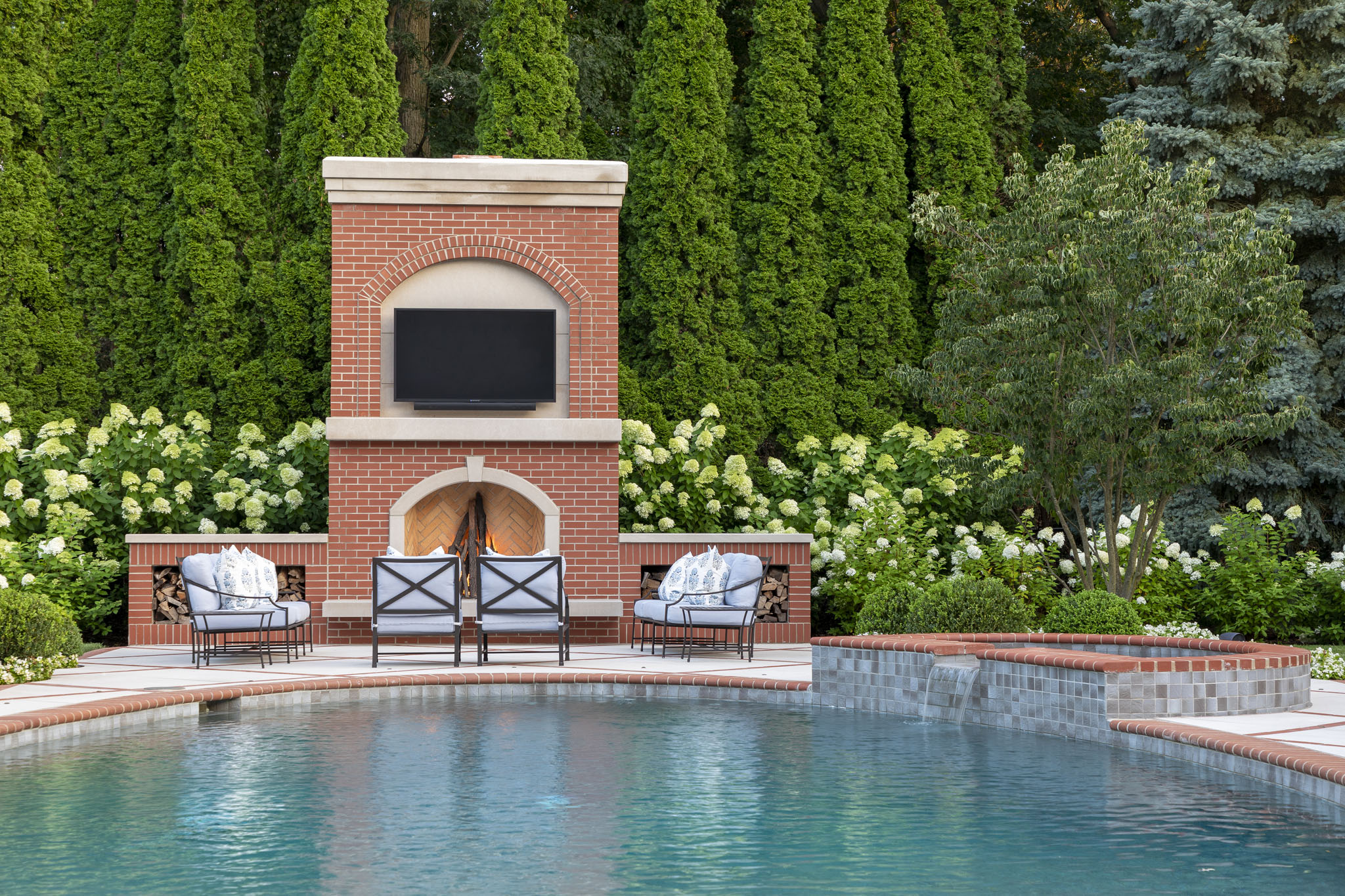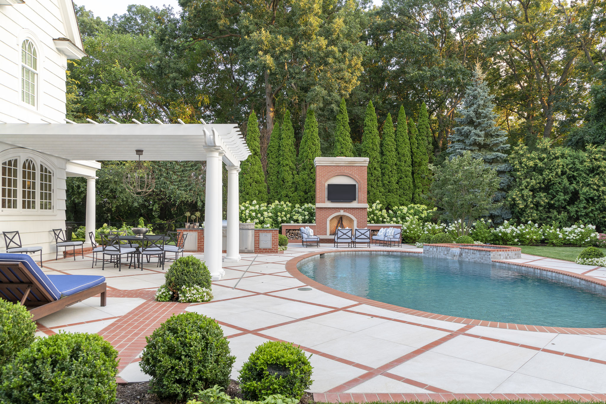 This backyard oasis blends timeless charm with refined elegance, featuring a stunning interplay of vibrant brick and smooth limestone that adds warmth and character. A grand outdoor fireplace anchors the seating area, where plush furnishings invite cozy gatherings beneath the evening sky. The shimmering pool, framed by classic stonework, serves as the heart of the space, seamlessly connecting to dining and lounge areas designed for both relaxation and entertaining. Layered plantings—lush greenery, cascading blooms, and sculpted hedges—soften the architectural elements, creating a rich, inviting atmosphere that feels both intimate and expansive.