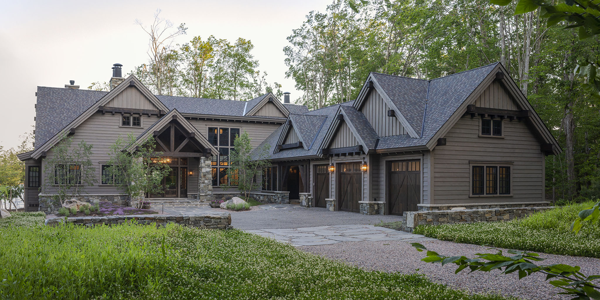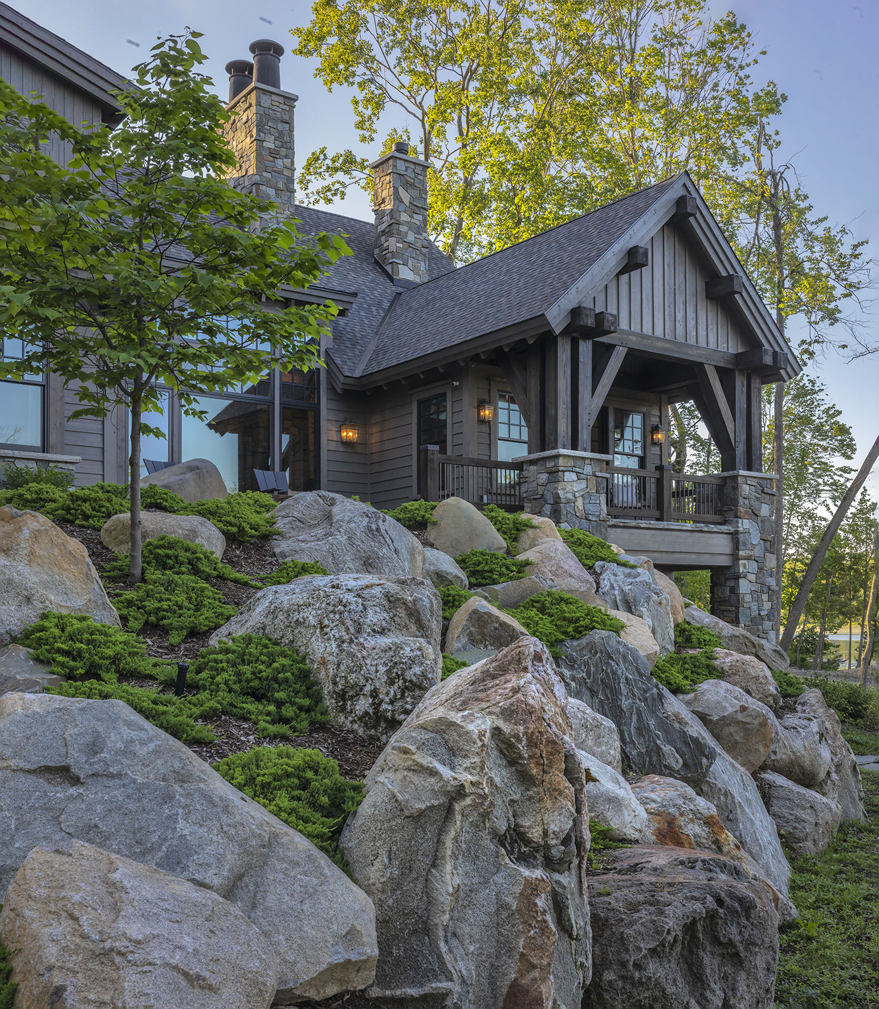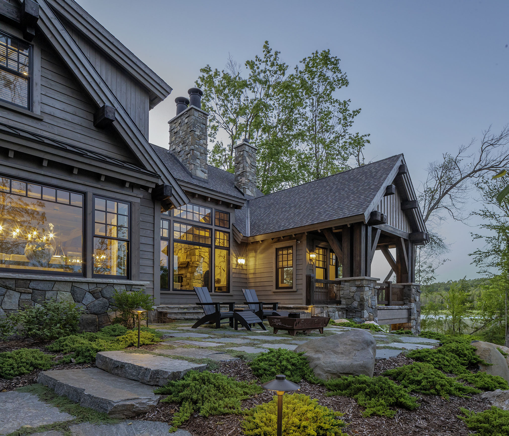 This landscape was carefully designed to make this new home feel as though it had always belonged to the land. Using natural elements and native plant materials, the design nestles the residence seamlessly into its surroundings. A hand-stacked stone wall defines and frames the front court, grounding the architecture in timeless craftsmanship. The driveway, softened with layers of crushed stone, creates a gentle and almost magical arrival experience. At the edges, large Lake Superior flagging stones anchor outdoor living areas into the terrain, with creeping thyme planted between the joints to blur the line between hardscape and nature. Together, these details establish a setting that feels authentic, enduring, and deeply rooted in place.