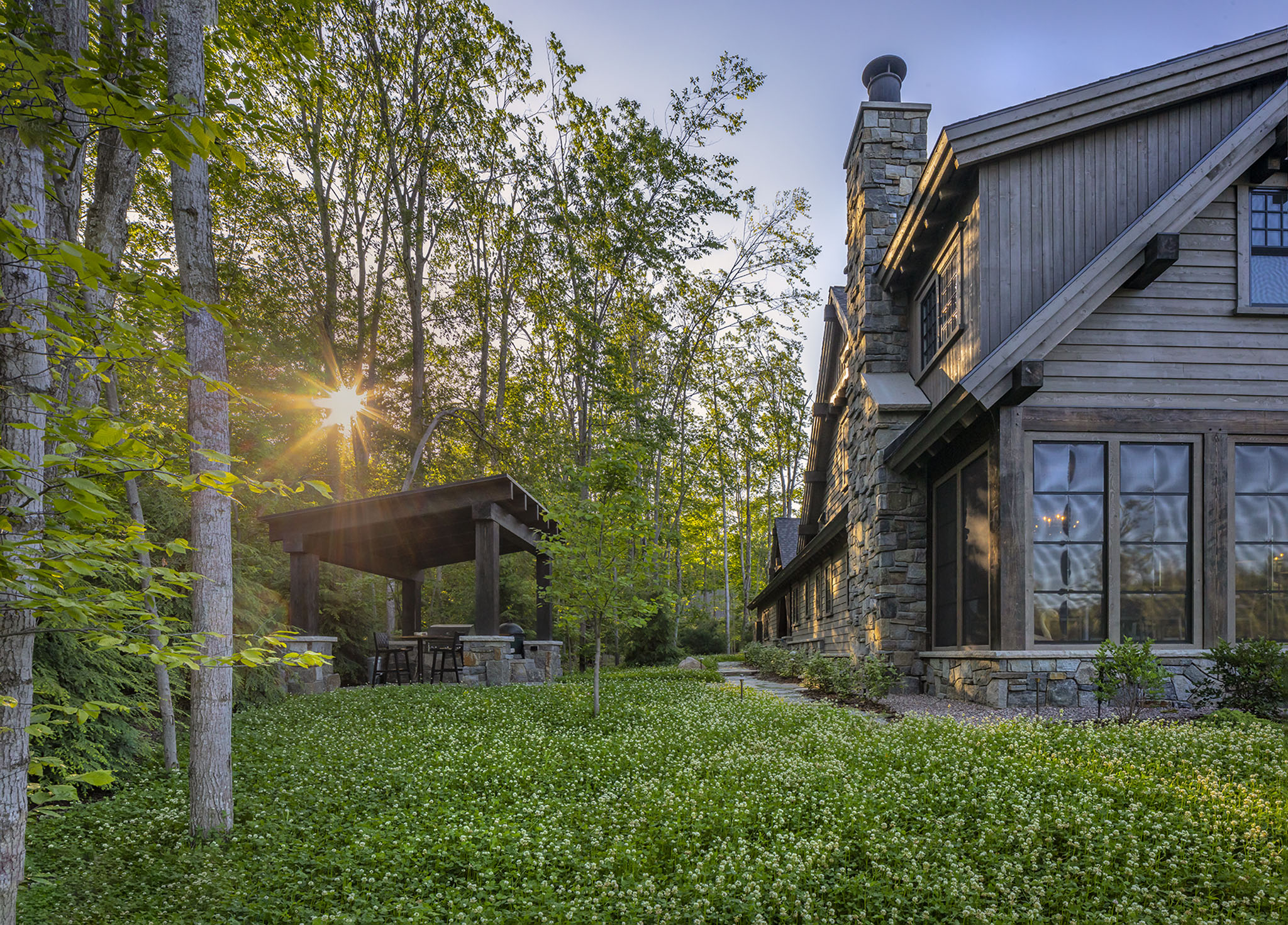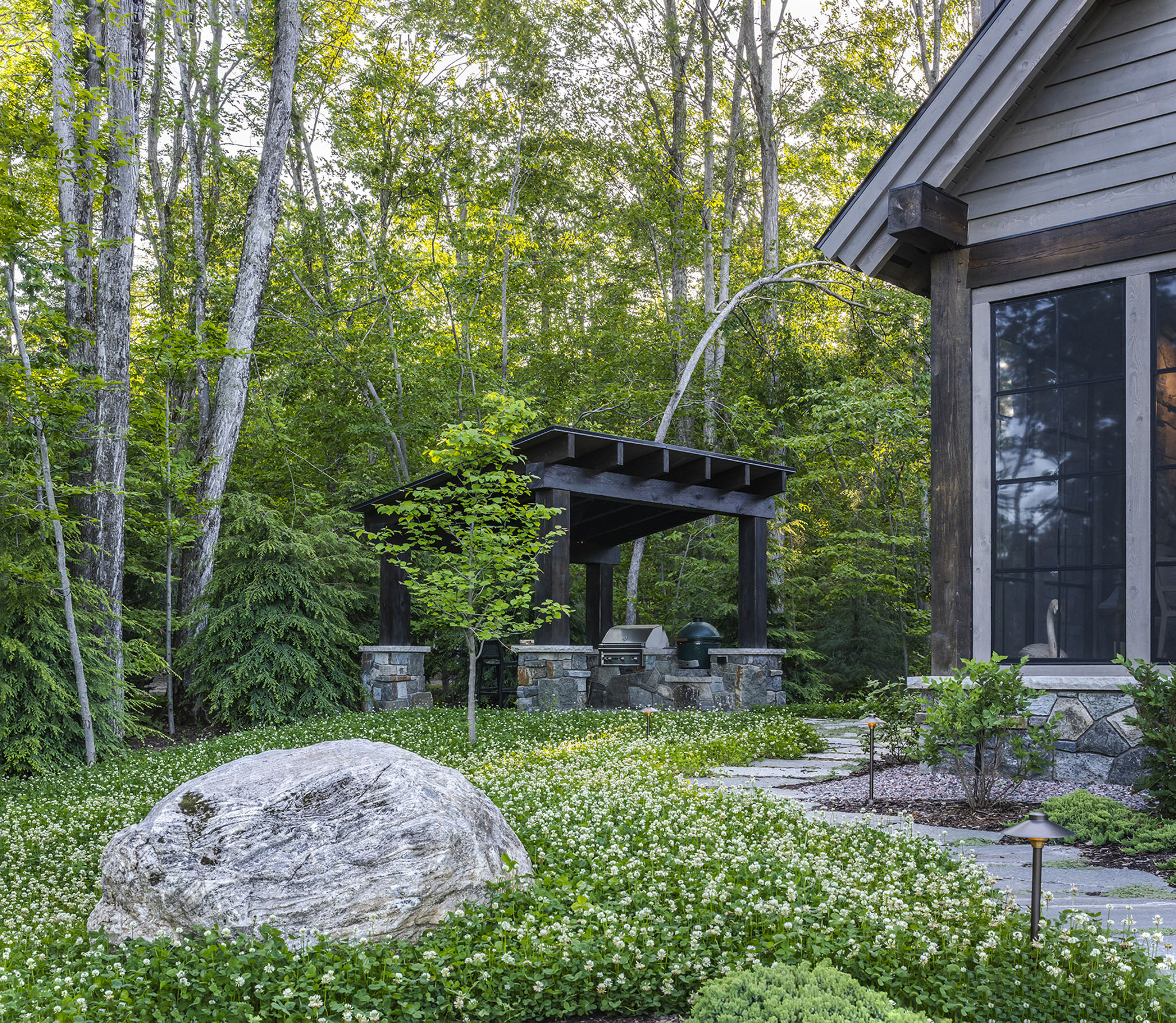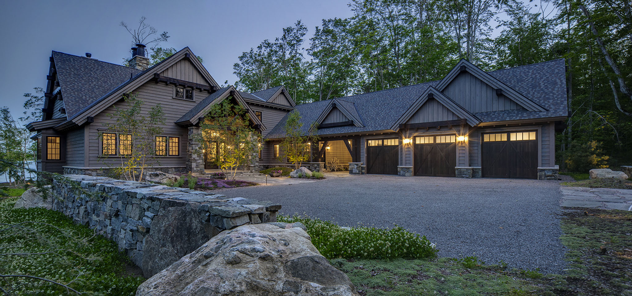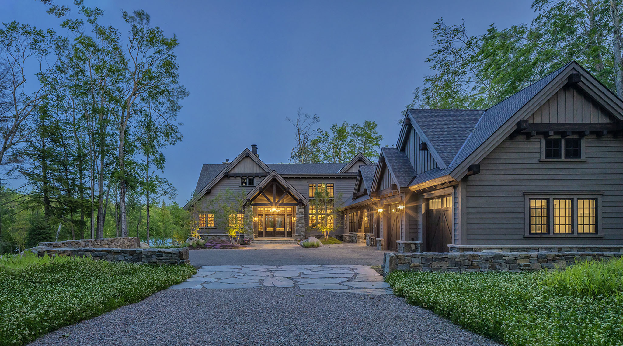 This landscape was carefully designed to make this new home feel as though it had always belonged to the land. Using natural elements and native plant materials, the design nestles the residence seamlessly into its surroundings. A hand-stacked stone wall defines and frames the front court, grounding the architecture in timeless craftsmanship. The driveway, softened with layers of crushed stone, creates a gentle and almost magical arrival experience. At the edges, large Lake Superior flagging stones anchor outdoor living areas into the terrain, with creeping thyme planted between the joints to blur the line between hardscape and nature. Together, these details establish a setting that feels authentic, enduring, and deeply rooted in place.