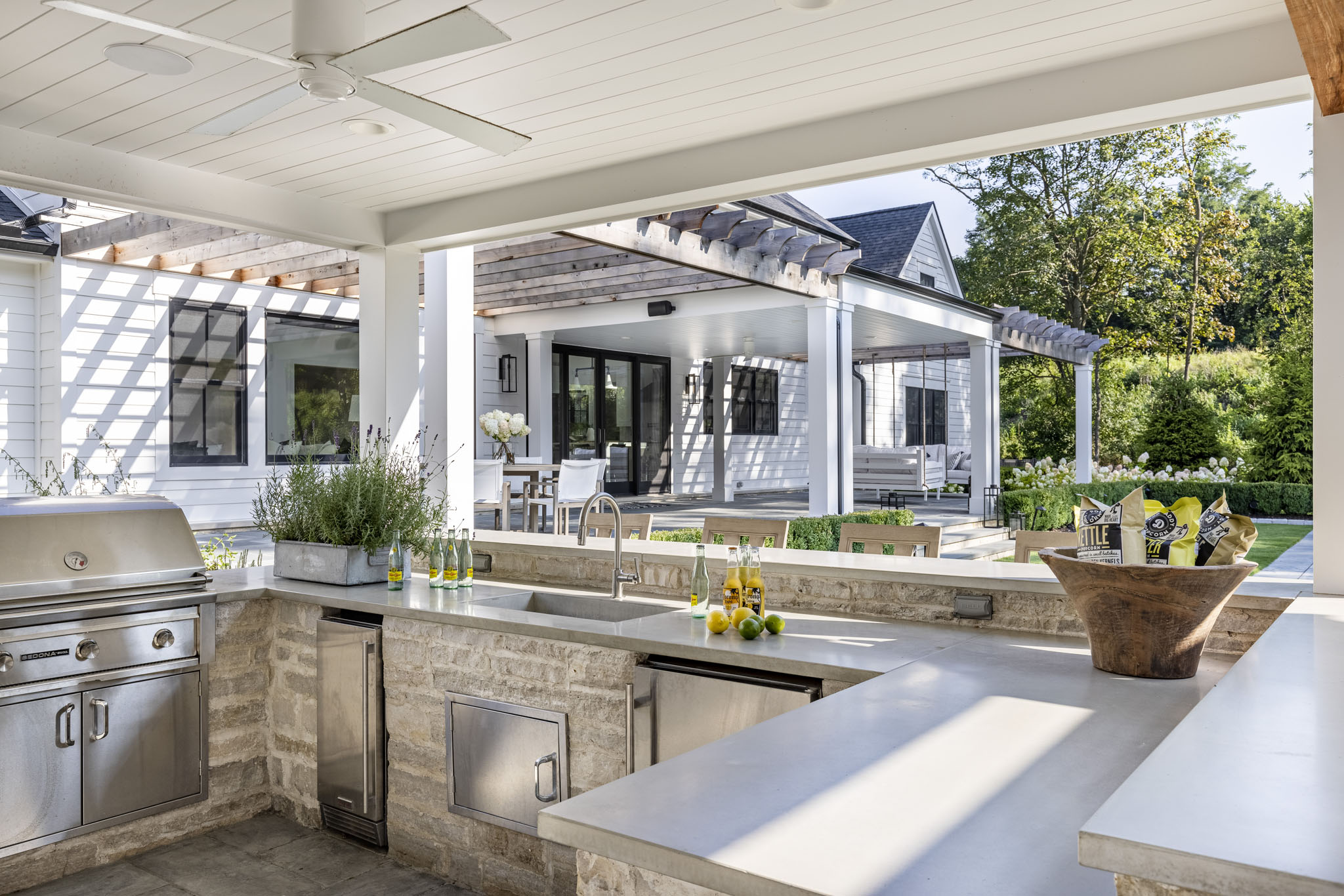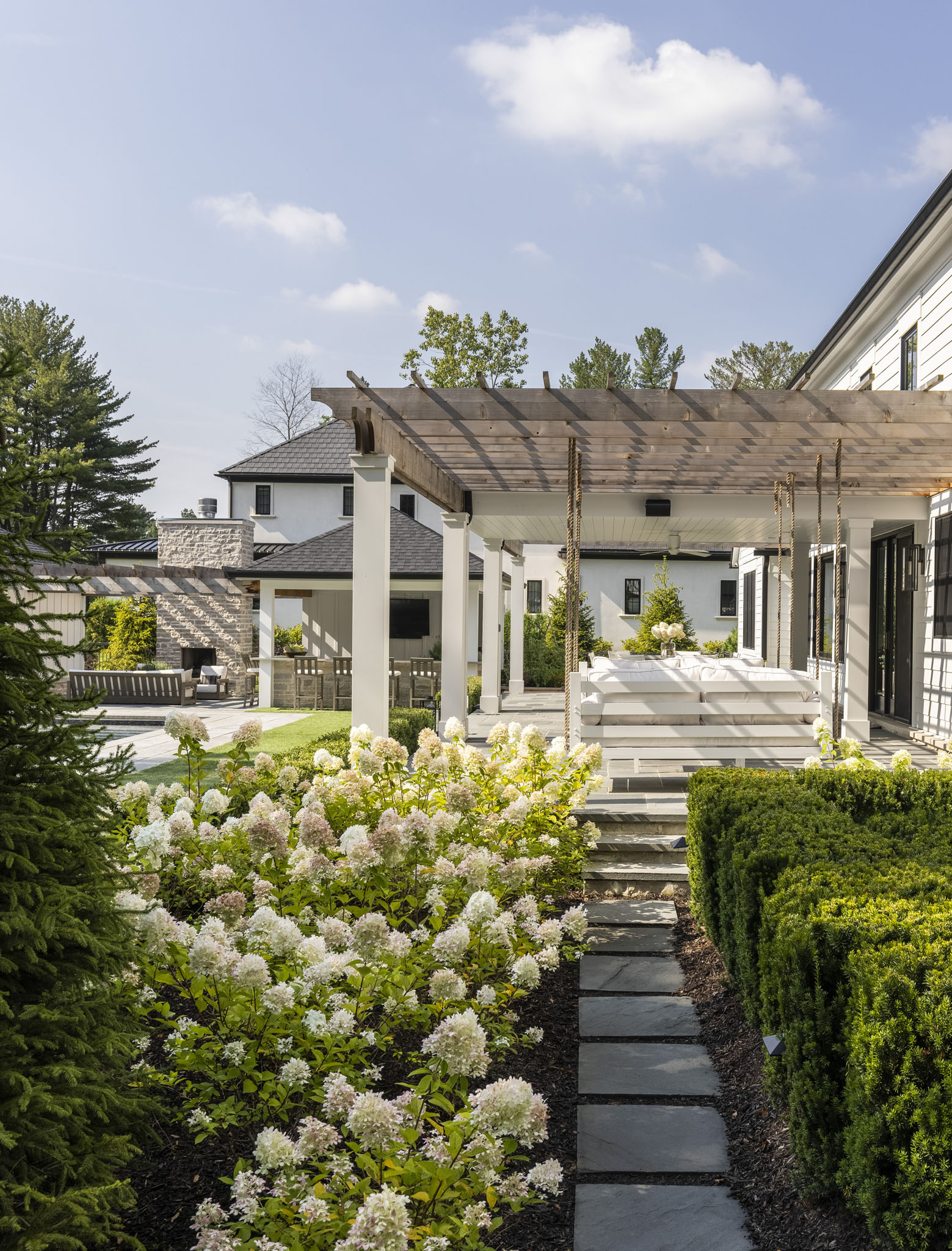 This backyard oasis captures the essence of Hamptons-style luxury, seamlessly blending elegance and comfort. A stunning pool, framed by a sophisticated mix of bluestone and lush turf, creates a crisp, timeless aesthetic. At its heart, a spacious open-air cabana offers the ultimate gathering space, featuring a stylish sit-up bar, a grand fireplace, and plush seating for effortless relaxation. Meticulously placed plantings—soft ornamental grasses, hydrangeas, and sculpted boxwoods—add warmth and texture, gently softening the clean lines of the space. With every detail carefully curated, this retreat embodies coastal sophistication and year-round outdoor living.