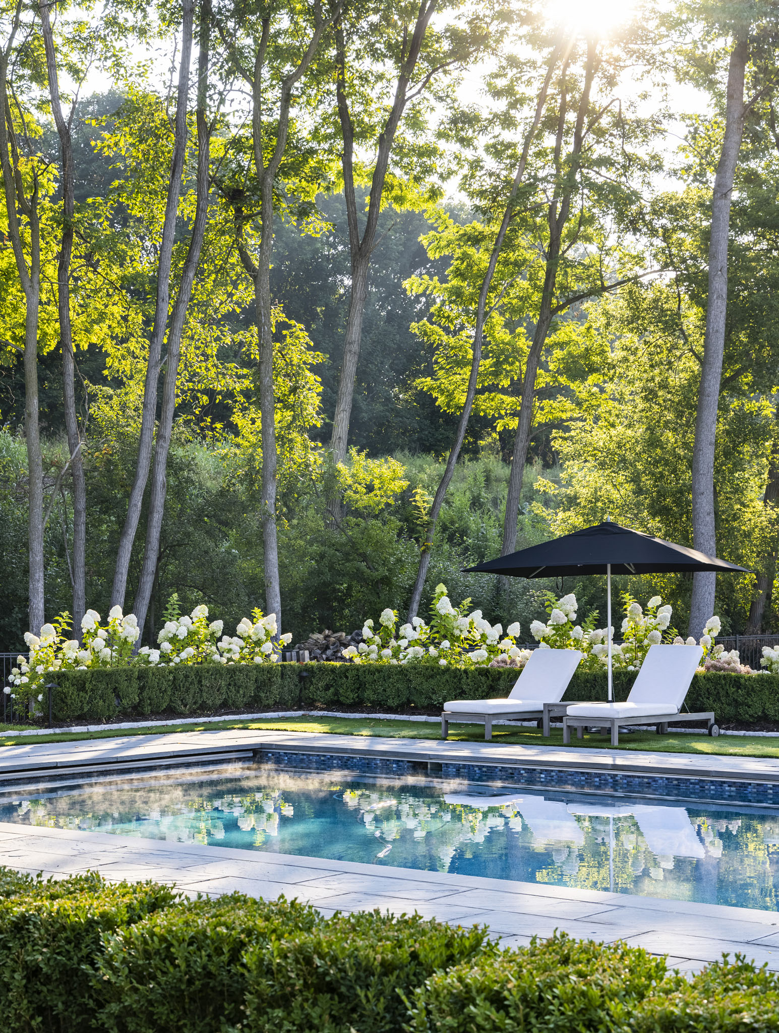 This backyard oasis captures the essence of Hamptons-style luxury, seamlessly blending elegance and comfort. A stunning pool, framed by a sophisticated mix of bluestone and lush turf, creates a crisp, timeless aesthetic. At its heart, a spacious open-air cabana offers the ultimate gathering space, featuring a stylish sit-up bar, a grand fireplace, and plush seating for effortless relaxation. Meticulously placed plantings—soft ornamental grasses, hydrangeas, and sculpted boxwoods—add warmth and texture, gently softening the clean lines of the space. With every detail carefully curated, this retreat embodies coastal sophistication and year-round outdoor living.