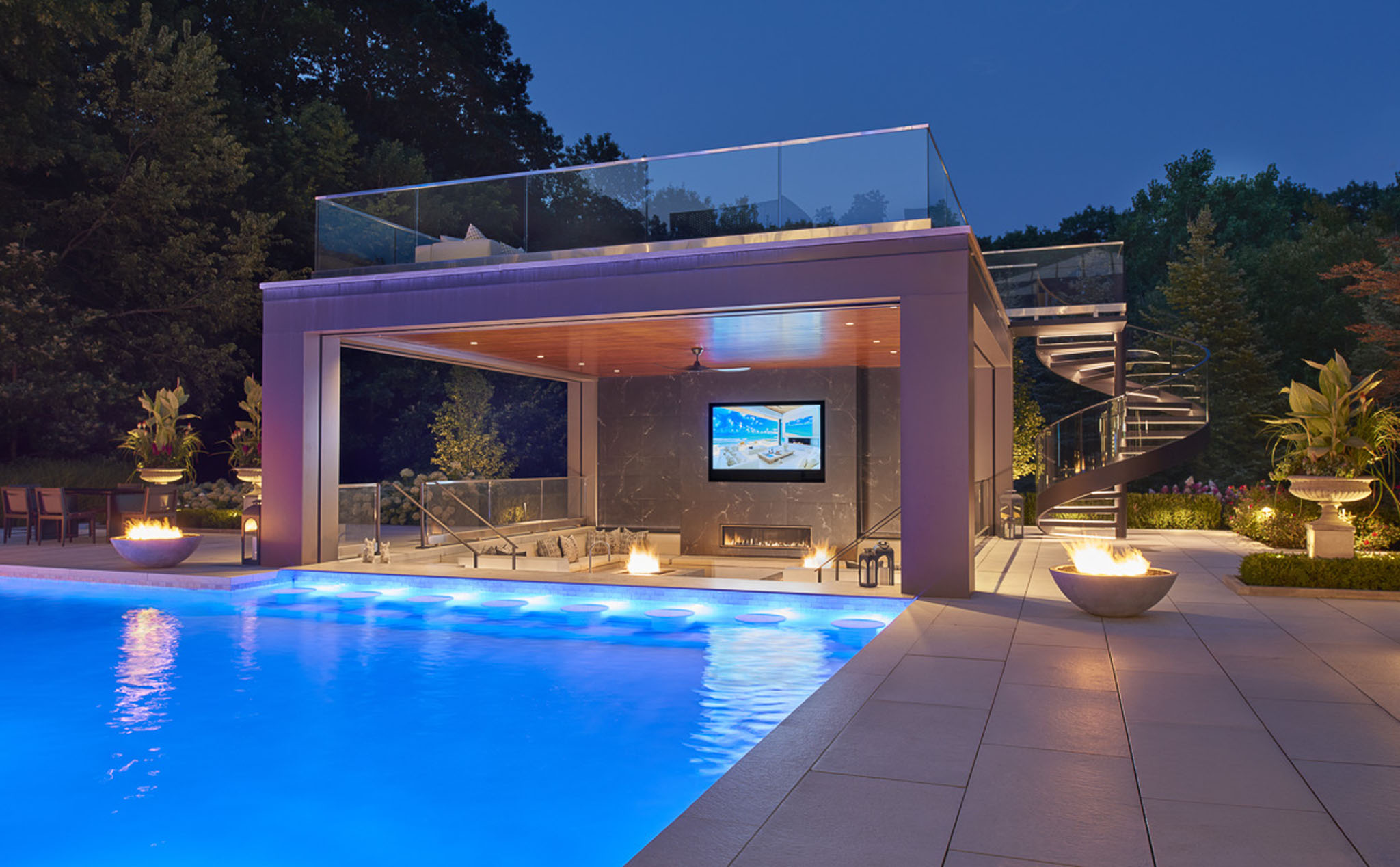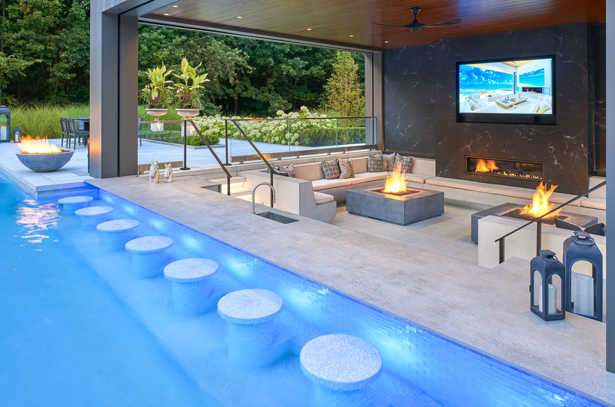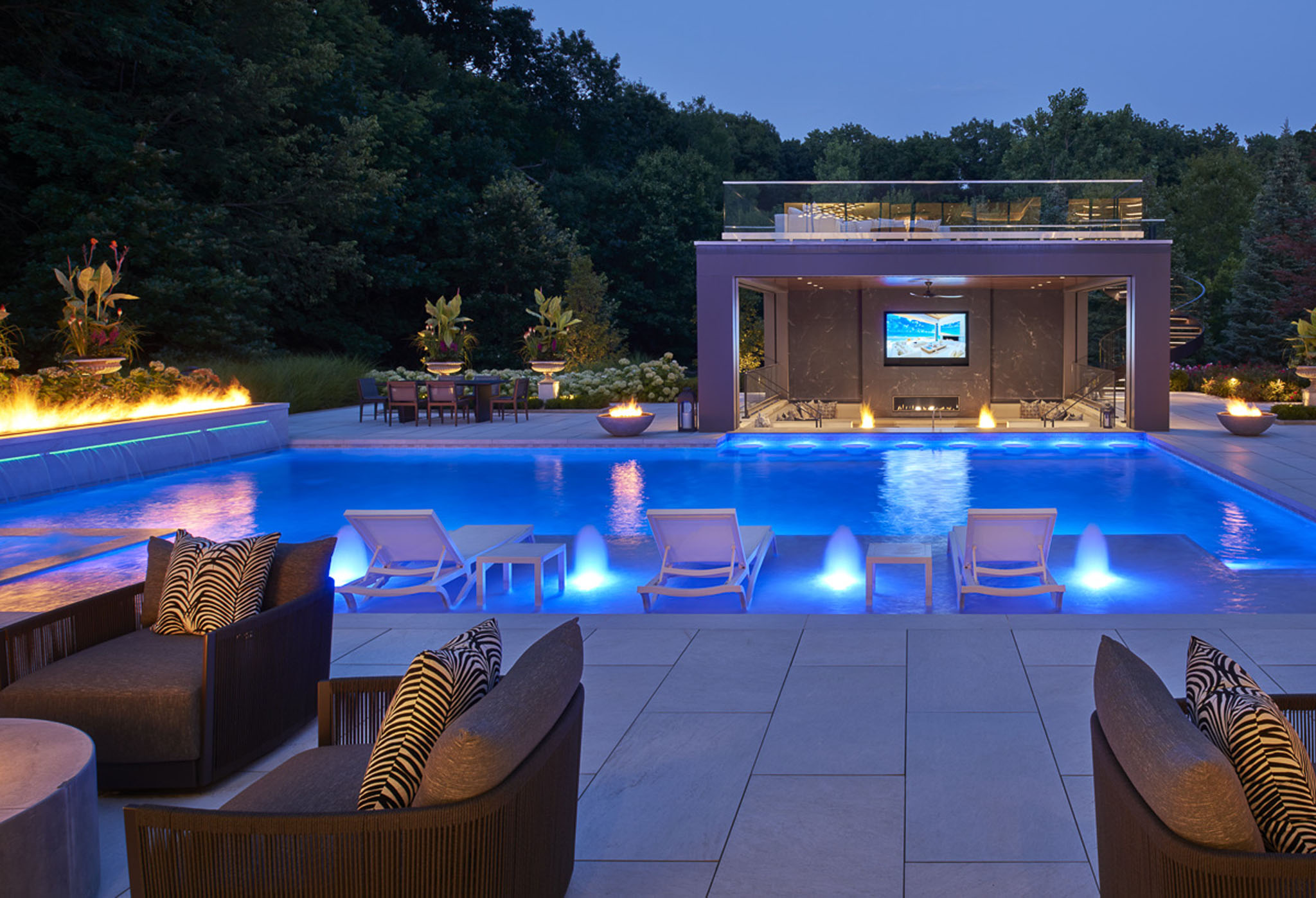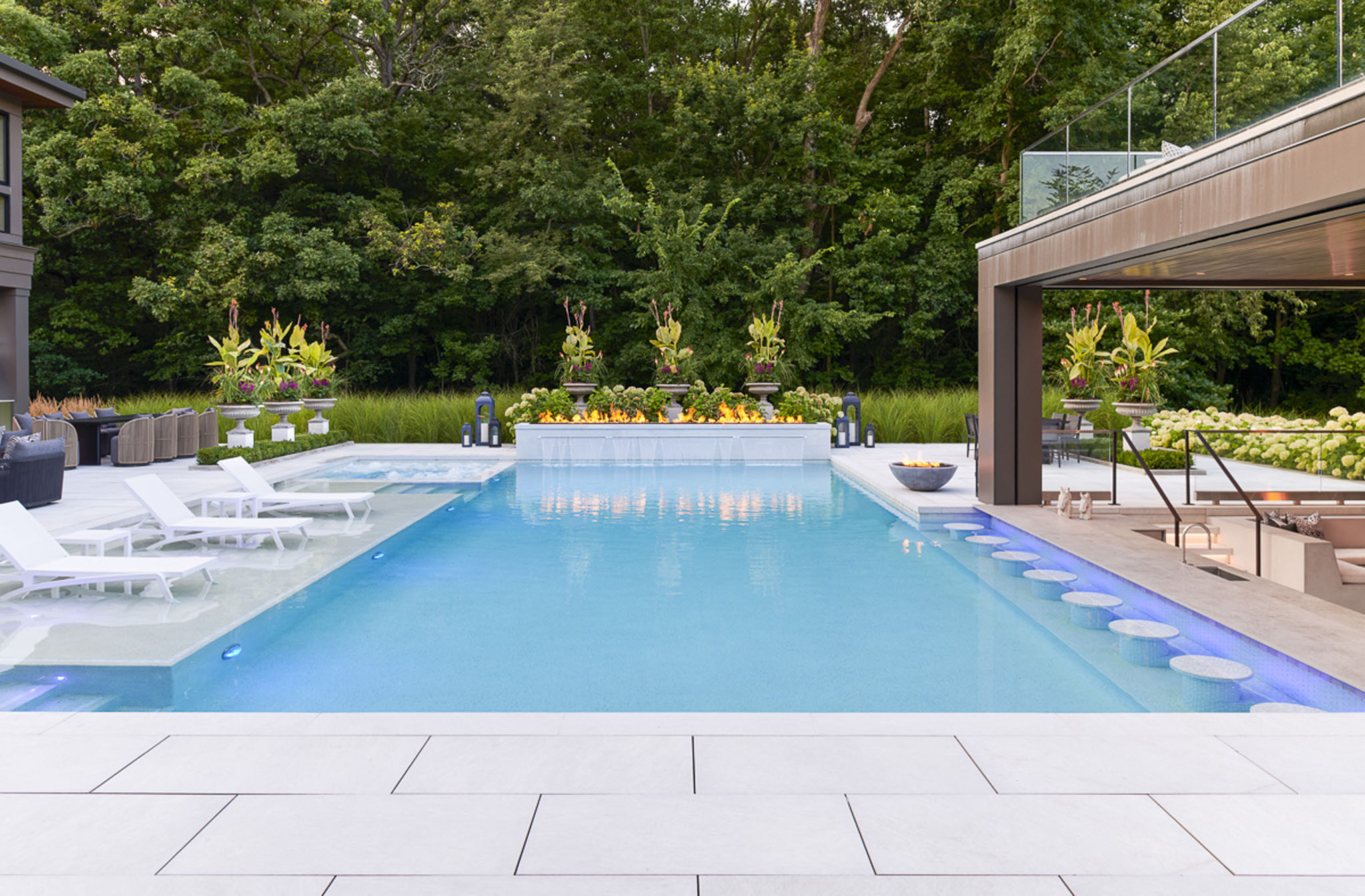 This stunningly conceived design transforms the landscape into a refined yet inviting retreat where every element is curated to balance luxury, comfort, and connection. At its heart lies a beautiful pool that seamlessly flows into an attached pool house featuring a sophisticated swim-up bar, blurring the line between leisure and architecture. A sunken fire and movie area creates an intimate gathering space, wrapped in the glow of flickering flames and the shimmer of reflected water. Above, a rooftop lounge offers elevated views and a private escape beneath the open sky. Thoughtful details throughout the pool deck including lush plantings tucked between sculpted stone, fire features dancing from within clean modern lines soften the geometry and infuse warmth into the contemporary aesthetic. The result is a masterful composition of form and feeling: a space that is both strikingly architectural and effortlessly serene.