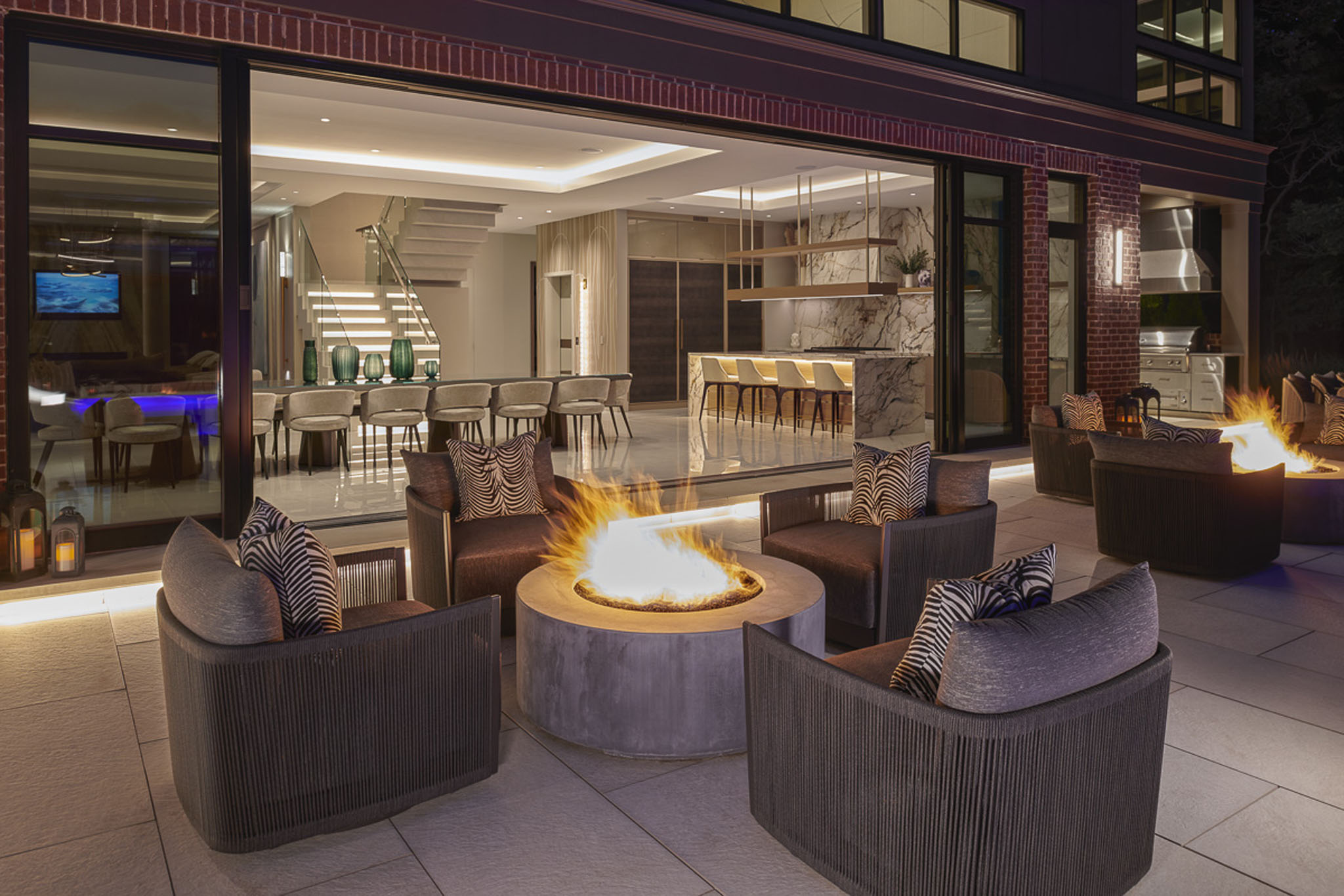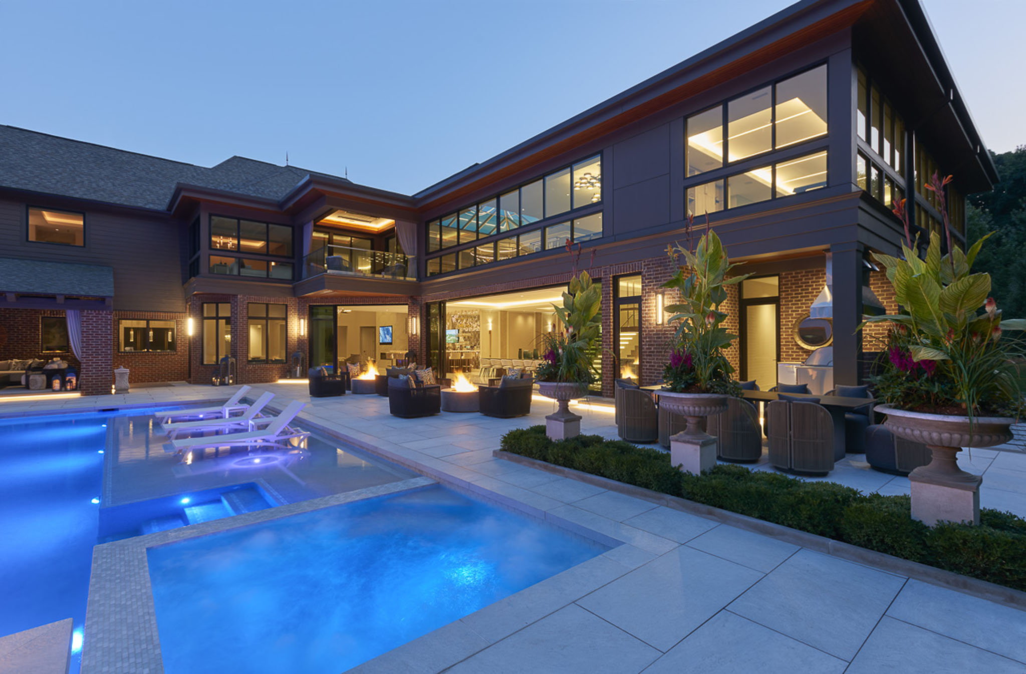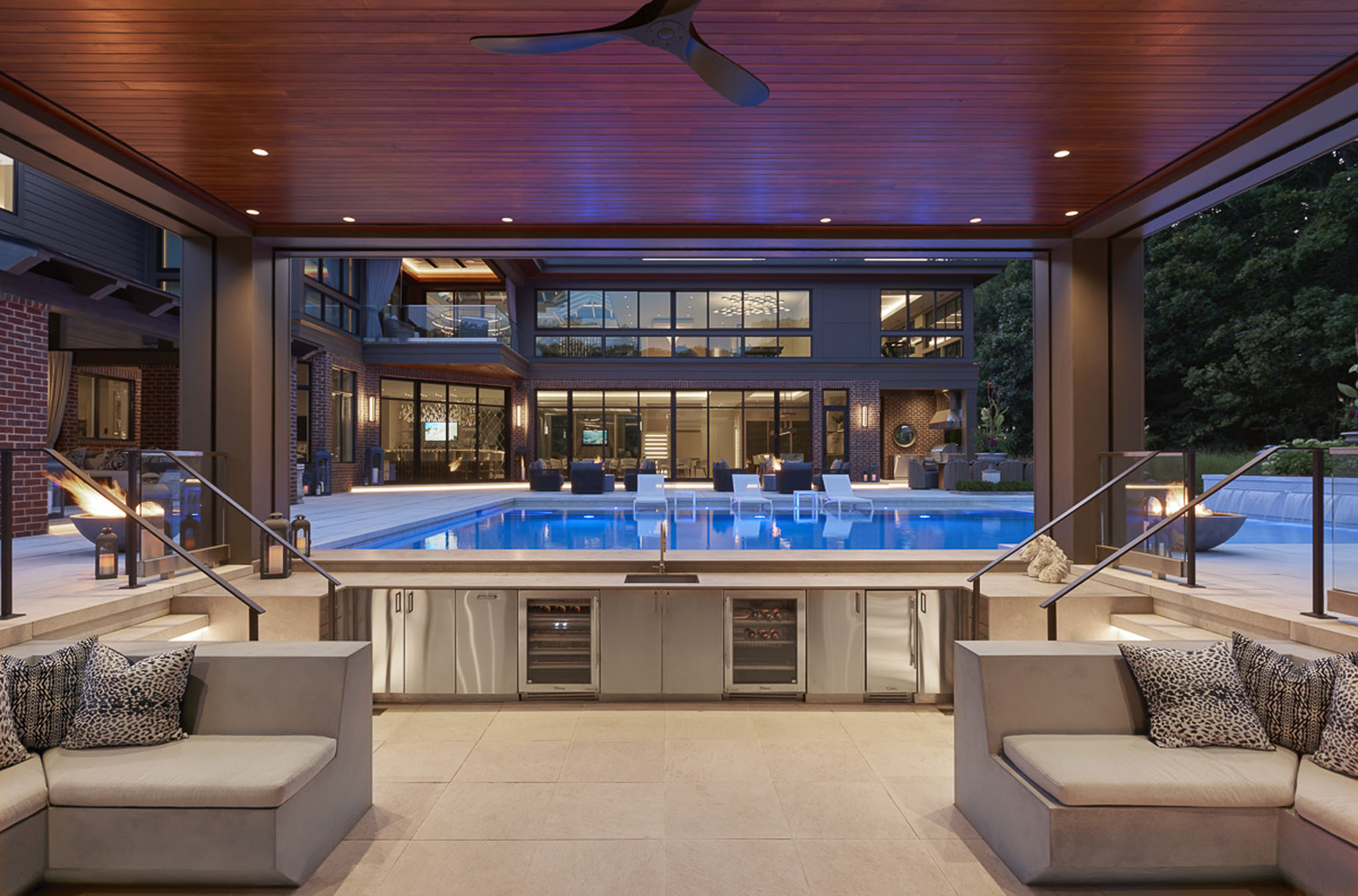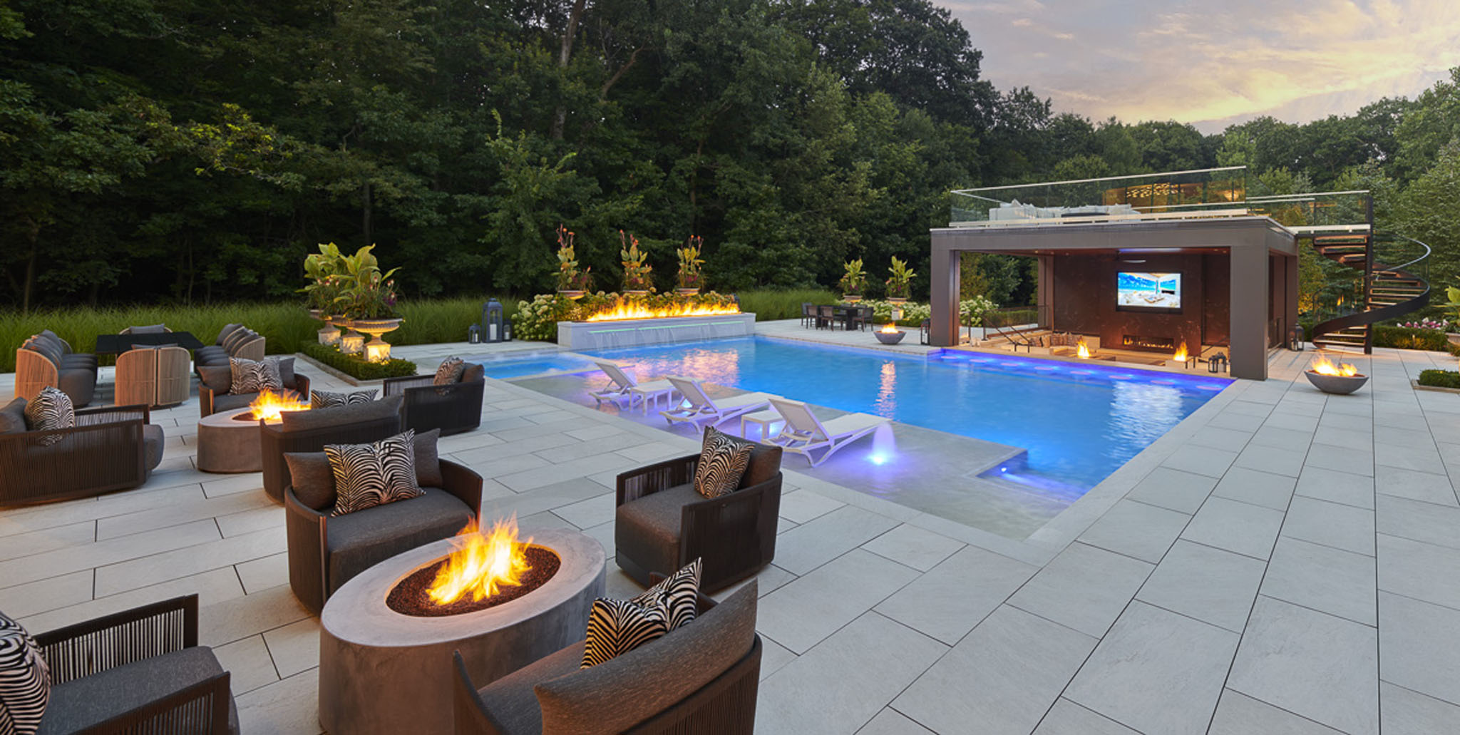 This stunningly conceived design transforms the landscape into a refined yet inviting retreat where every element is curated to balance luxury, comfort, and connection. At its heart lies a beautiful pool that seamlessly flows into an attached pool house featuring a sophisticated swim-up bar, blurring the line between leisure and architecture. A sunken fire and movie area creates an intimate gathering space, wrapped in the glow of flickering flames and the shimmer of reflected water. Above, a rooftop lounge offers elevated views and a private escape beneath the open sky. Thoughtful details throughout the pool deck including lush plantings tucked between sculpted stone, fire features dancing from within clean modern lines soften the geometry and infuse warmth into the contemporary aesthetic. The result is a masterful composition of form and feeling: a space that is both strikingly architectural and effortlessly serene.