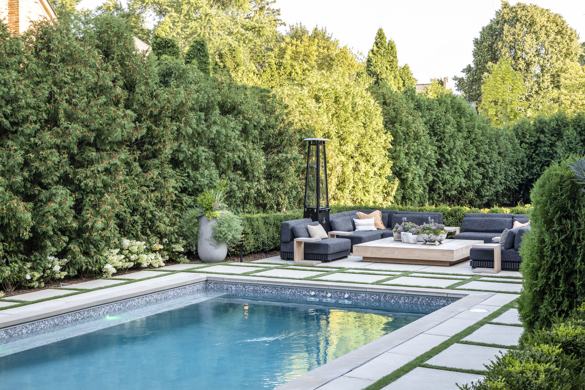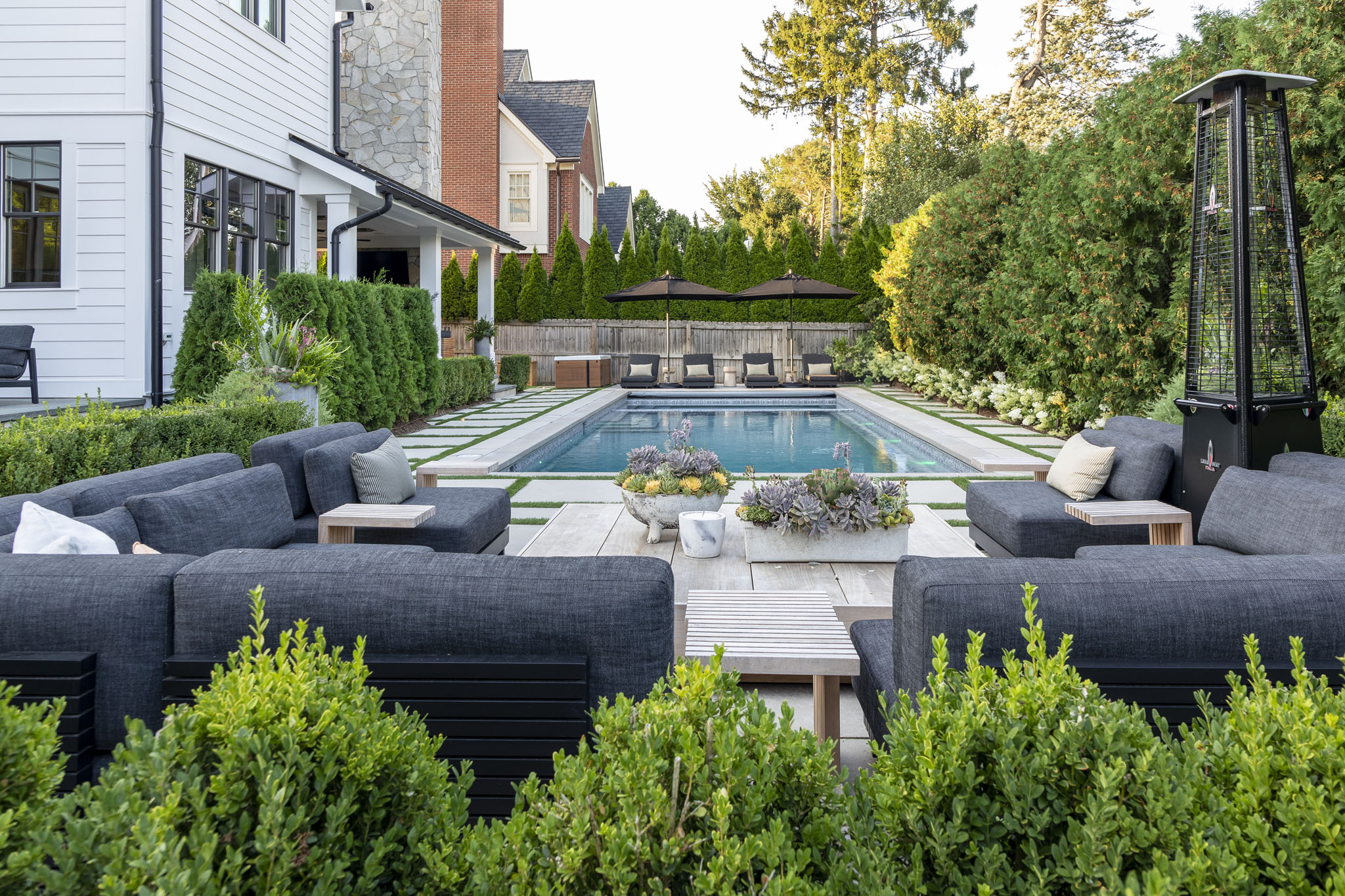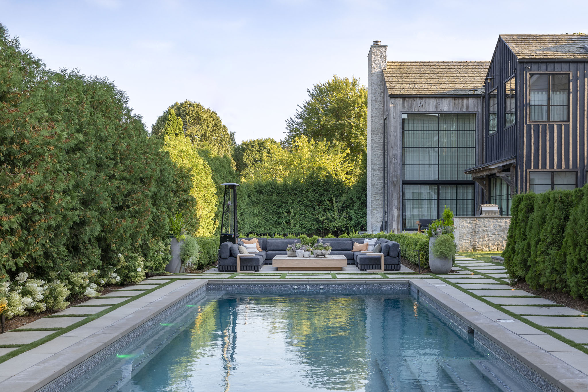This intimate backyard oasis seamlessly nestles a sleek pool into its compact space, creating a retreat that feels both expansive and inviting. Soft greenery, from Hydrangea to lush, sculpted shrubs, frames the water’s edge, adding depth and tranquility. Elegant flower pots bursting with seasonal blooms provide pops of color, strategically placed to enhance the pool’s serene ambiance. Fire elements, from a built-in fireplace to a cozy fire table, cast a warm glow in the evenings, creating a magical contrast against the cool blue water. Thoughtfully designed, this backyard blends luxury and comfort, transforming a small space into a stunning escape.