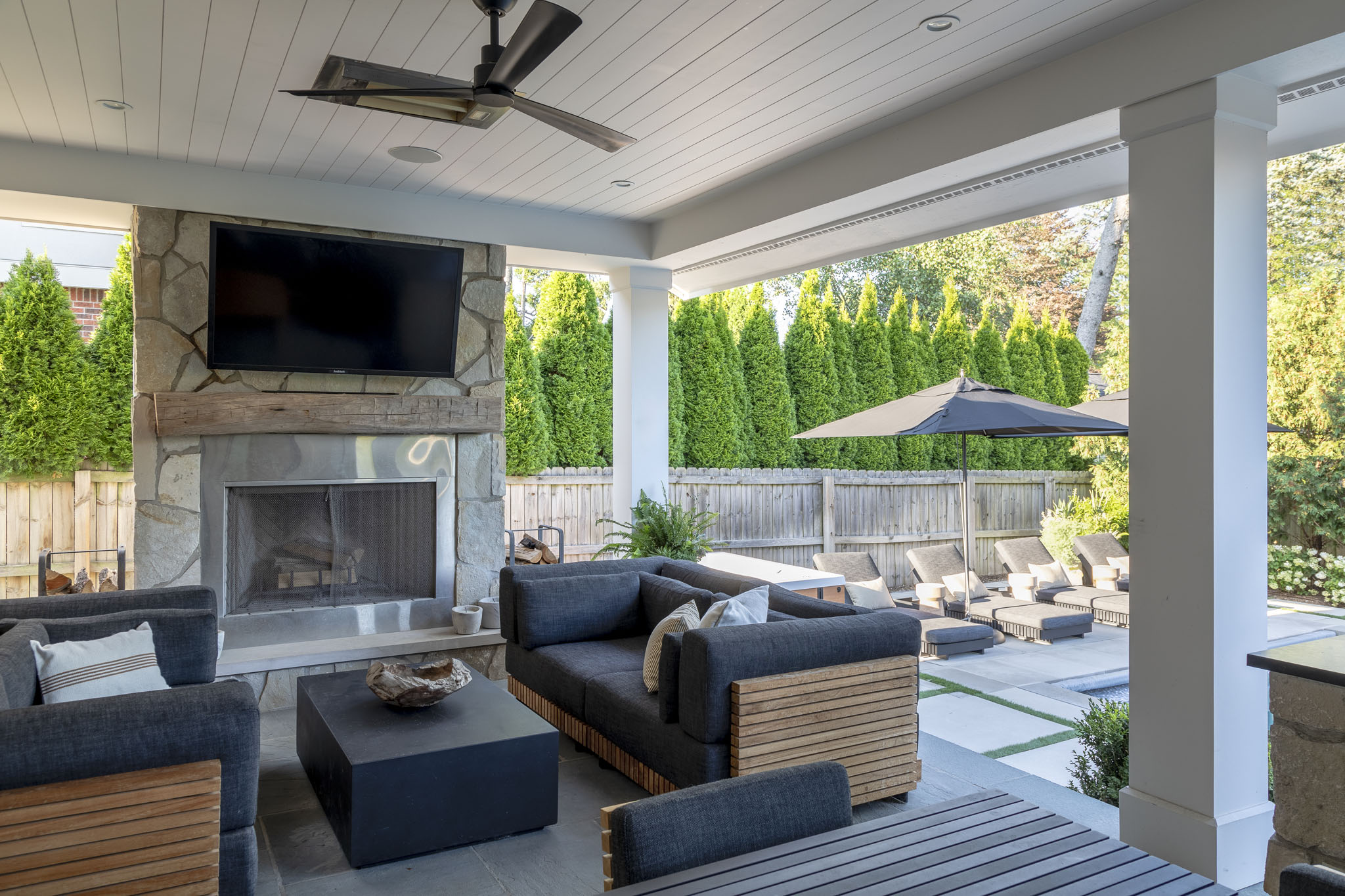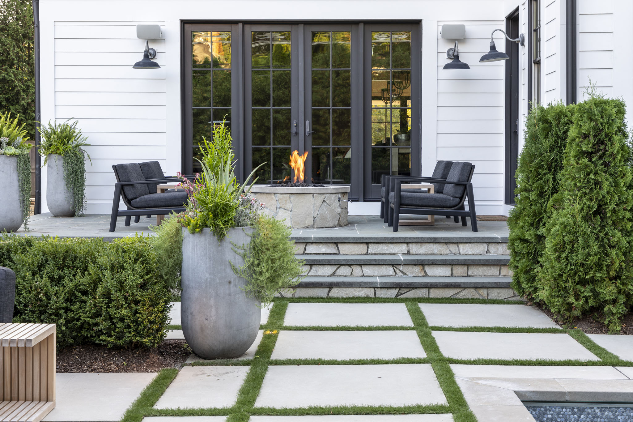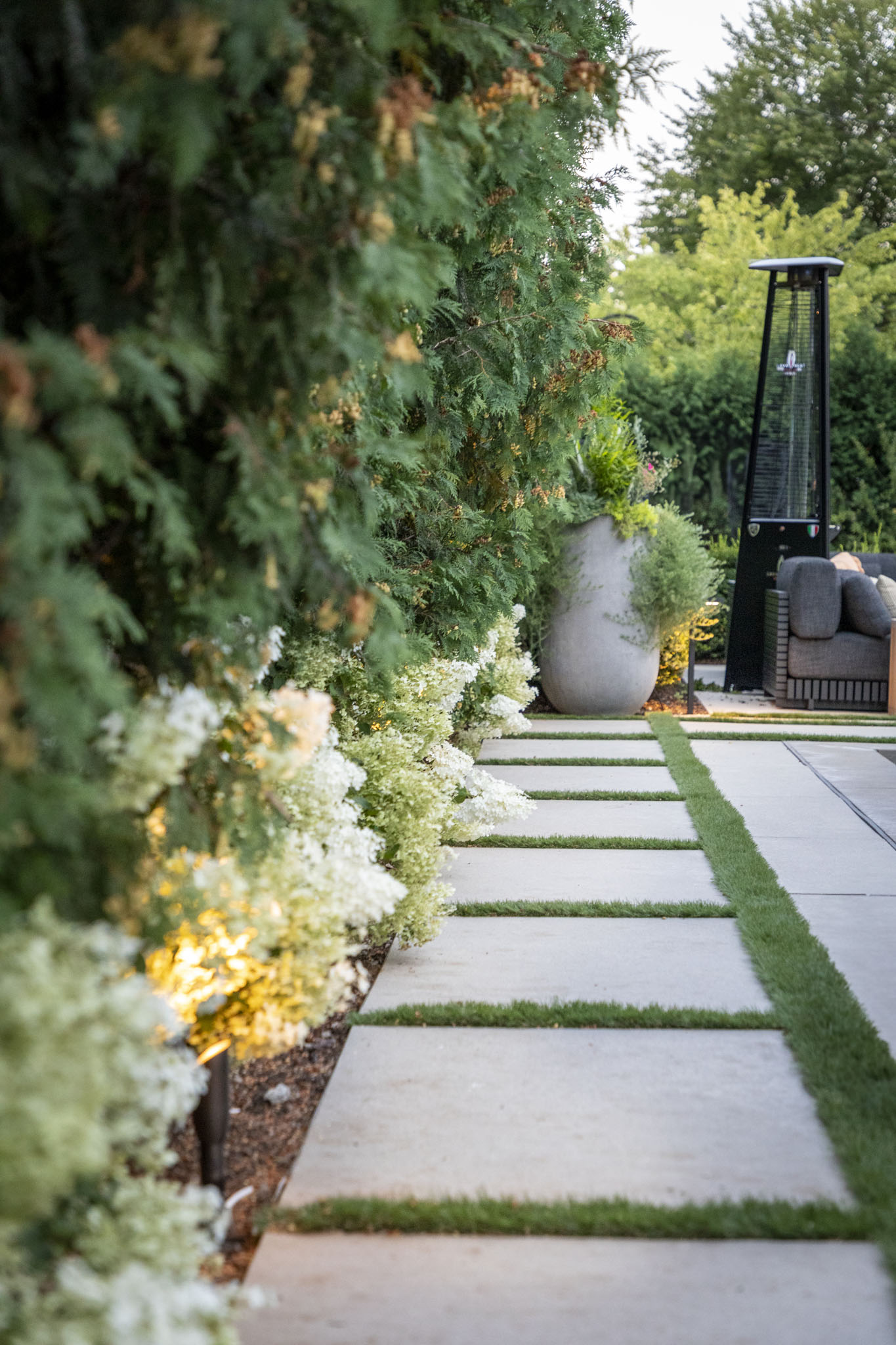 This intimate backyard oasis seamlessly nestles a sleek pool into its compact space, creating a retreat that feels both expansive and inviting. Soft greenery, from Hydrangea to lush, sculpted shrubs, frames the water’s edge, adding depth and tranquility. Elegant flower pots bursting with seasonal blooms provide pops of color, strategically placed to enhance the pool’s serene ambiance. Fire elements, from a built-in fireplace to a cozy fire table, cast a warm glow in the evenings, creating a magical contrast against the cool blue water. Thoughtfully designed, this backyard blends luxury and comfort, transforming a small space into a stunning escape.