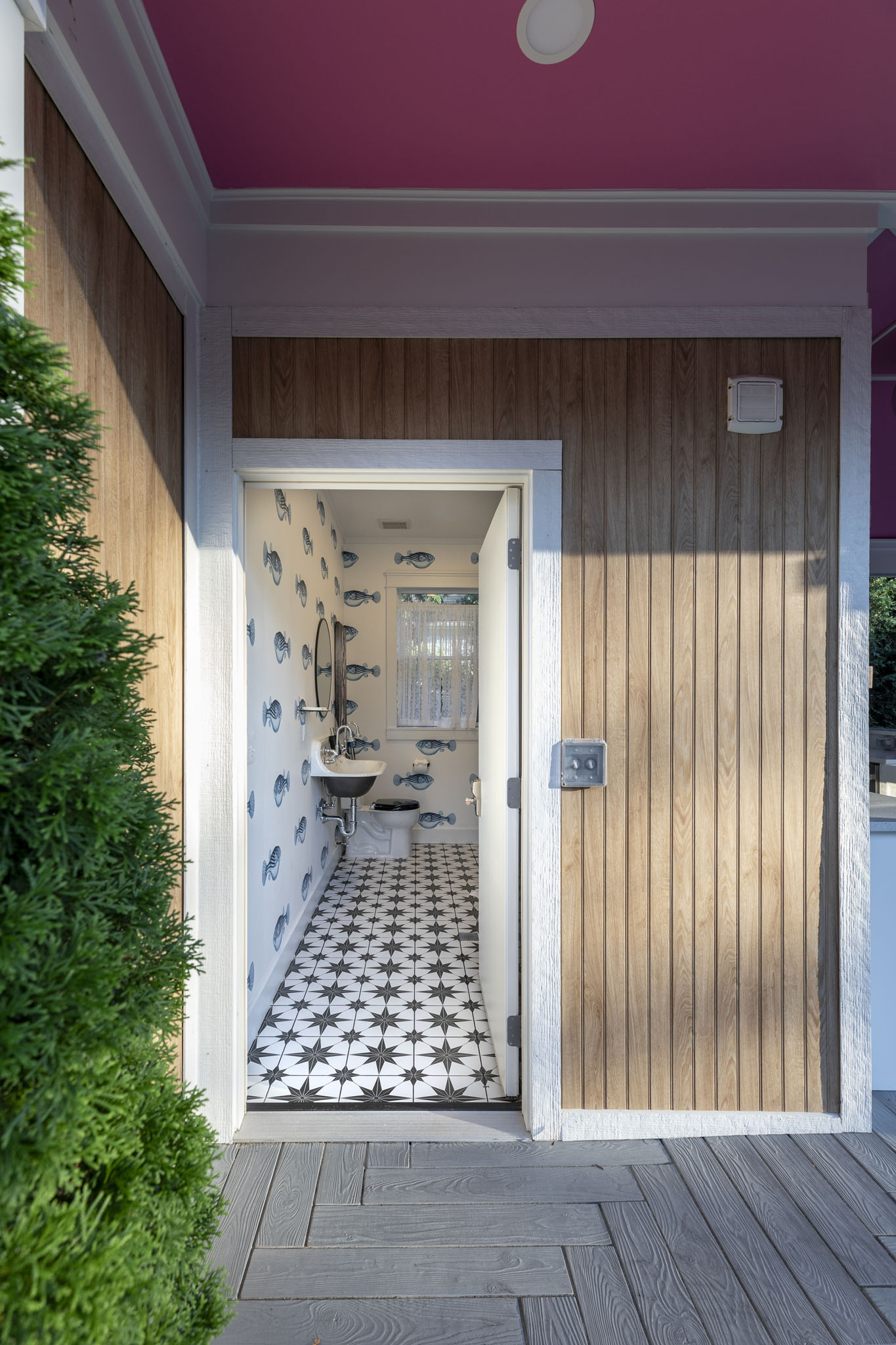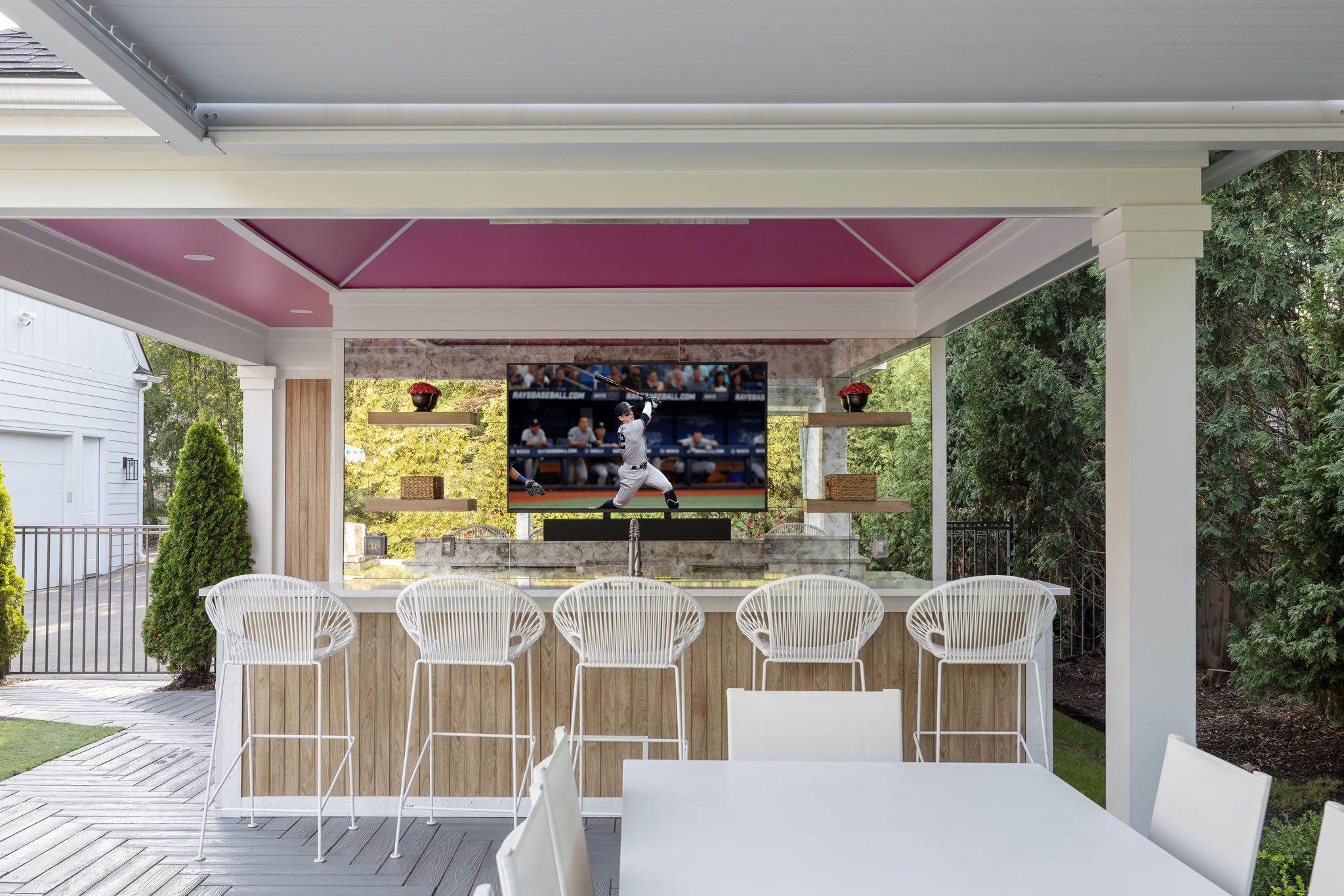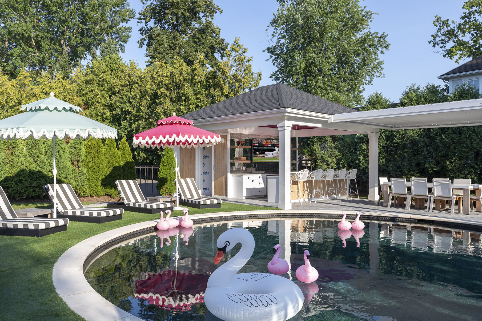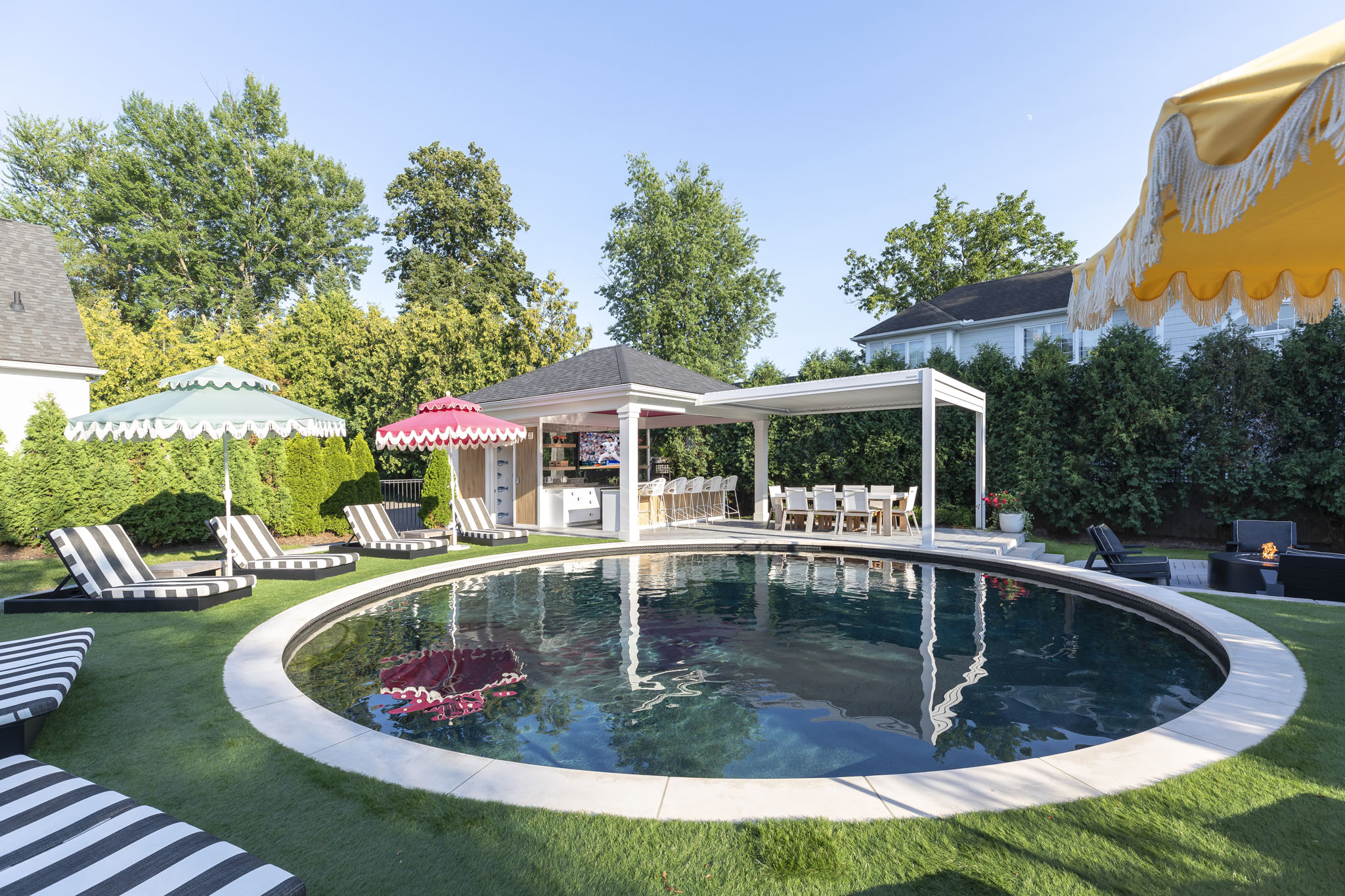 The outdoor living space is designed as a vibrant throwback retreat, anchored by a striking round pool at its center that sets the stage for playful energy and relaxation. Surrounding the pool, bold pops of color: retro loungers, colorful cushions, and bright colored umbrellas create a lively, nostalgic atmosphere. A shimmering disco ball suspended in the pool cabana area catches the sun by day and sparkles under ambient lighting at night, casting a playful glow across the scene. Funky details like patterned tile accents, curved seating nooks, and eclectic planters add to the retro charm, while the overall layout encourages both social gatherings and carefree lounging, making it a space that feels equal parts fun, stylish, and unforgettable.