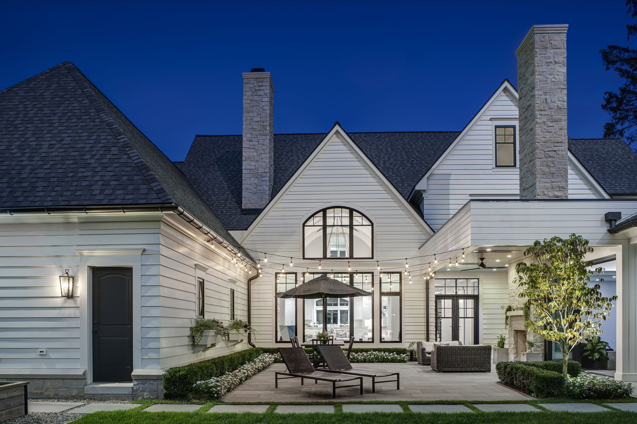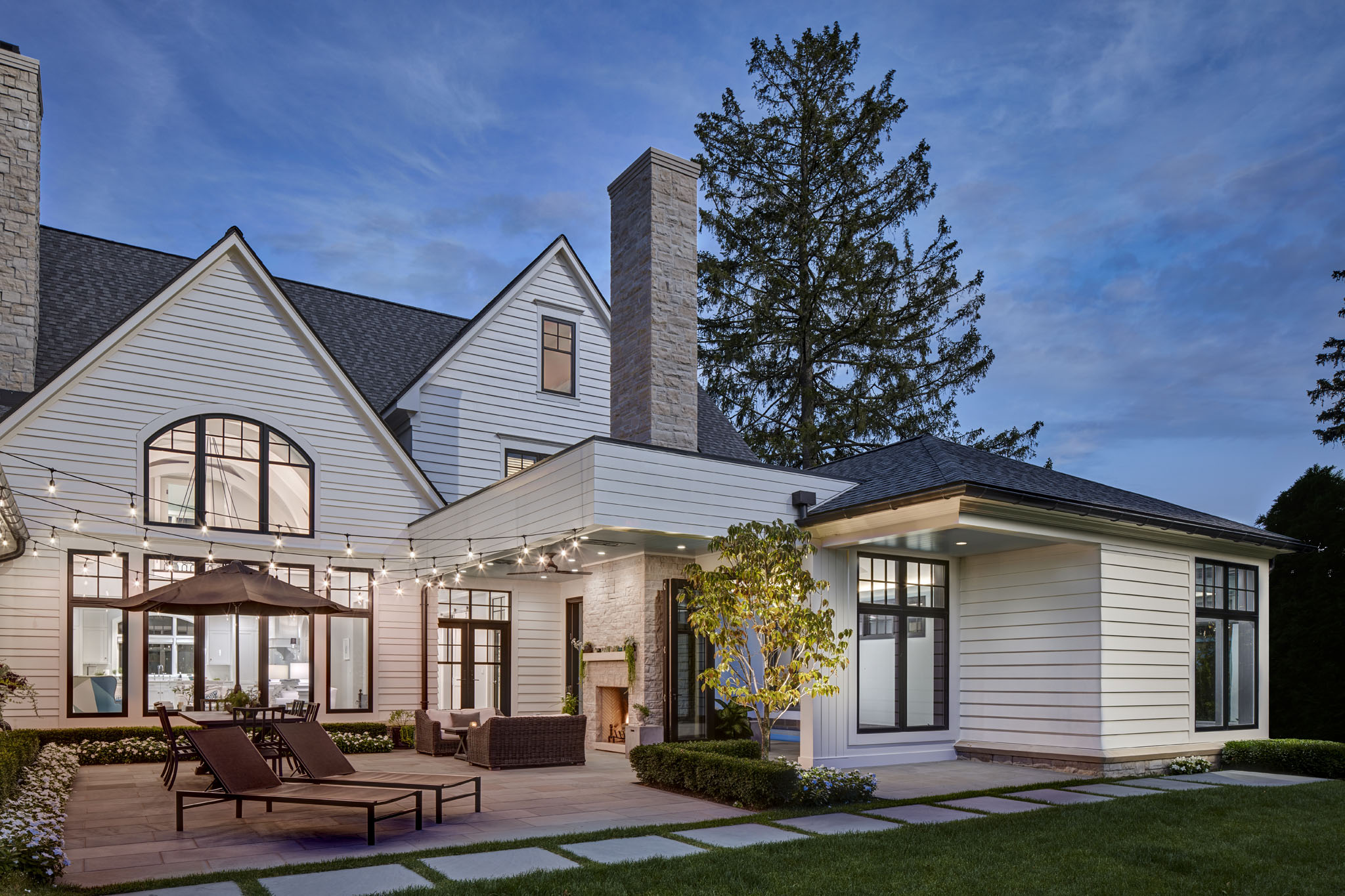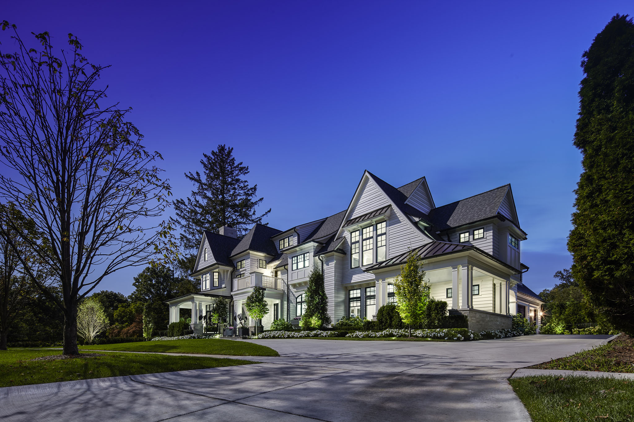 This home is seamlessly balanced into the landscape through masterful design that harmonizes architecture with nature. Thoughtfully sculpted terrain, plantings, and strategic tree placement soften the home’s presence, allowing it to blend effortlessly into its surroundings. Custom stonework, meticulously crafted to mirror the land’s natural textures, extends the living experience outdoors, creating a fluid transition between interior and exterior spaces. Expansive patios, intimate seating areas, and a carefully positioned fire feature enhance the sense of connection to the land, while layered plantings and natural pathways create a tranquil, immersive environment that feels both intentional and organic.