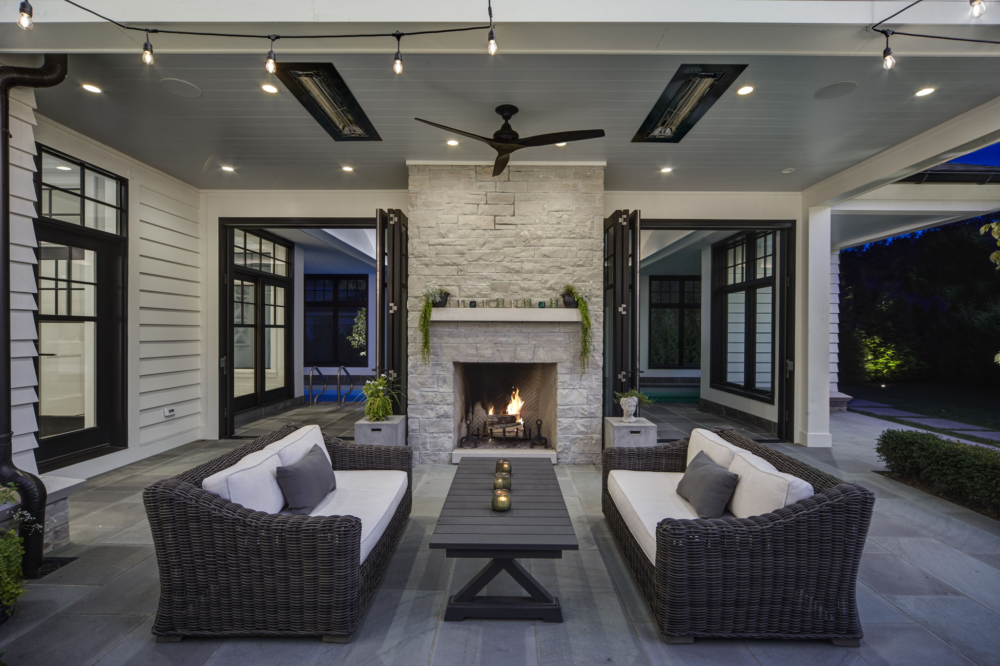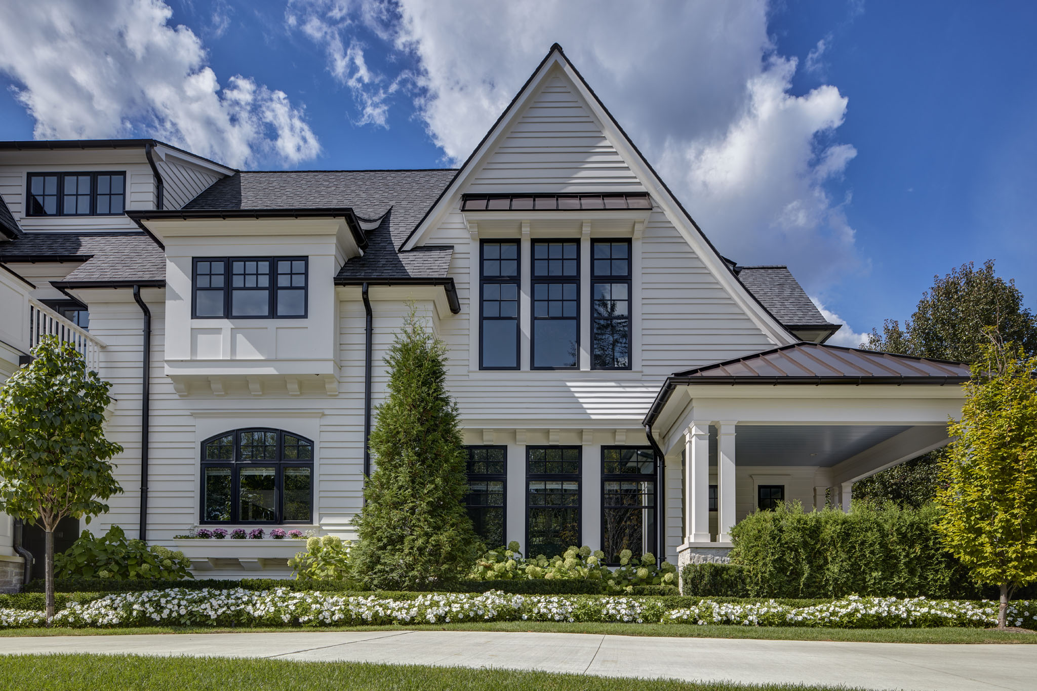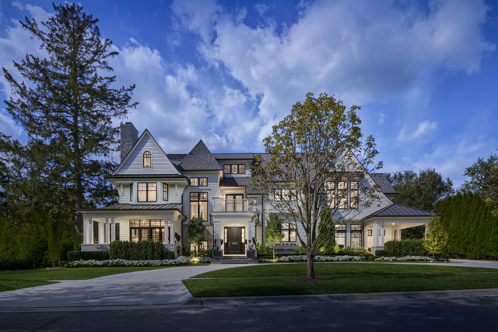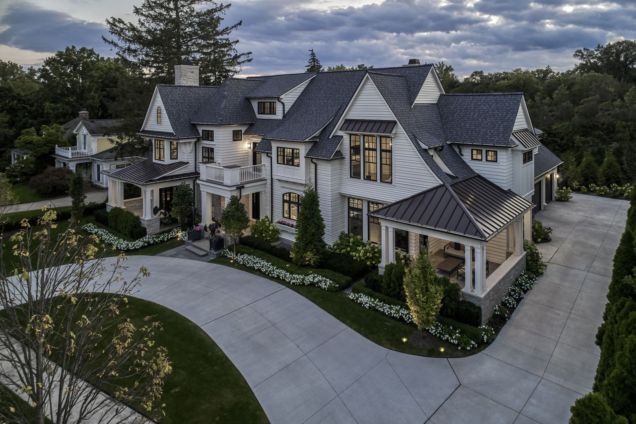 This home is seamlessly balanced into the landscape through masterful design that harmonizes architecture with nature. Thoughtfully sculpted terrain, plantings, and strategic tree placement soften the home’s presence, allowing it to blend effortlessly into its surroundings. Custom stonework, meticulously crafted to mirror the land’s natural textures, extends the living experience outdoors, creating a fluid transition between interior and exterior spaces. Expansive patios, intimate seating areas, and a carefully positioned fire feature enhance the sense of connection to the land, while layered plantings and natural pathways create a tranquil, immersive environment that feels both intentional and organic.