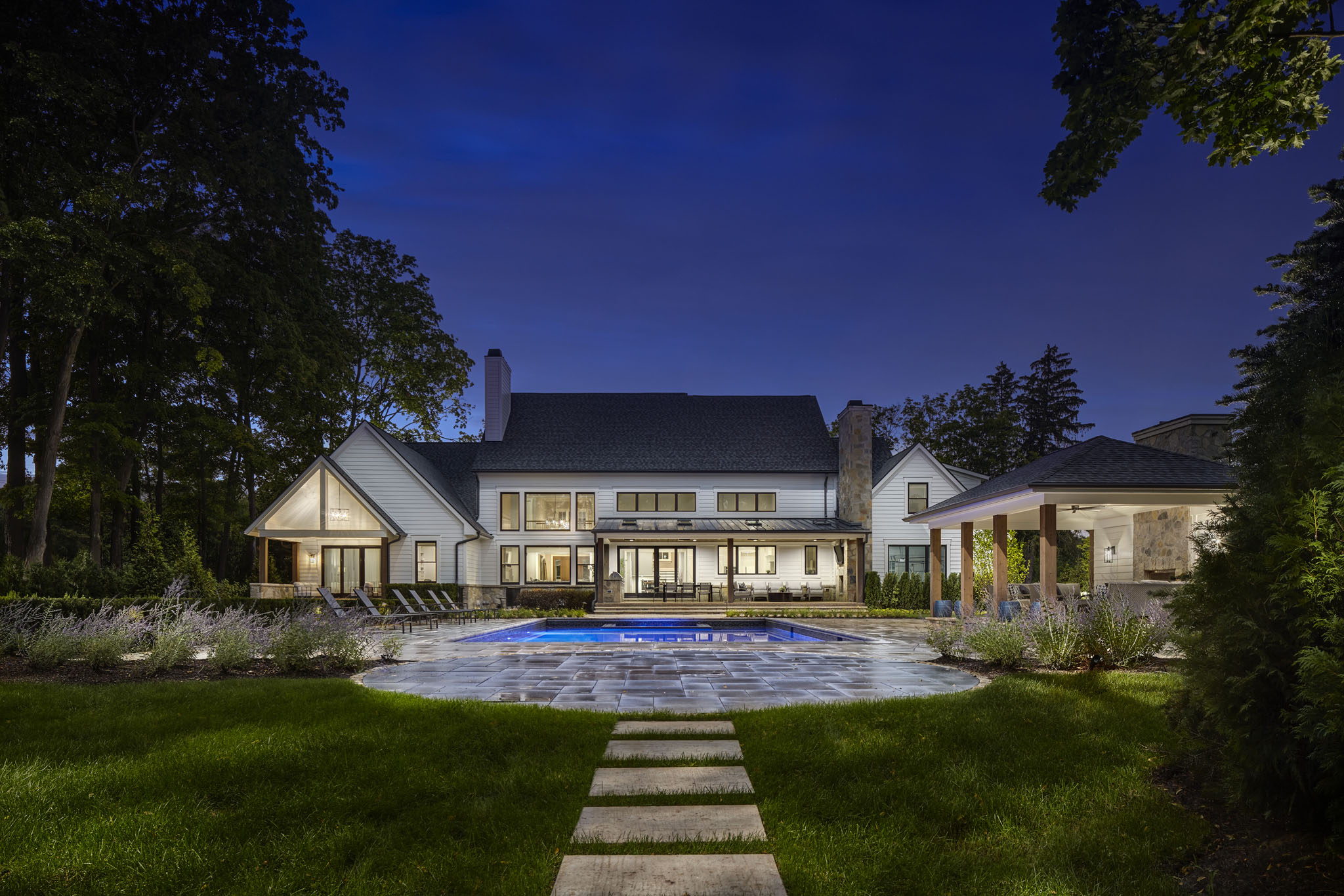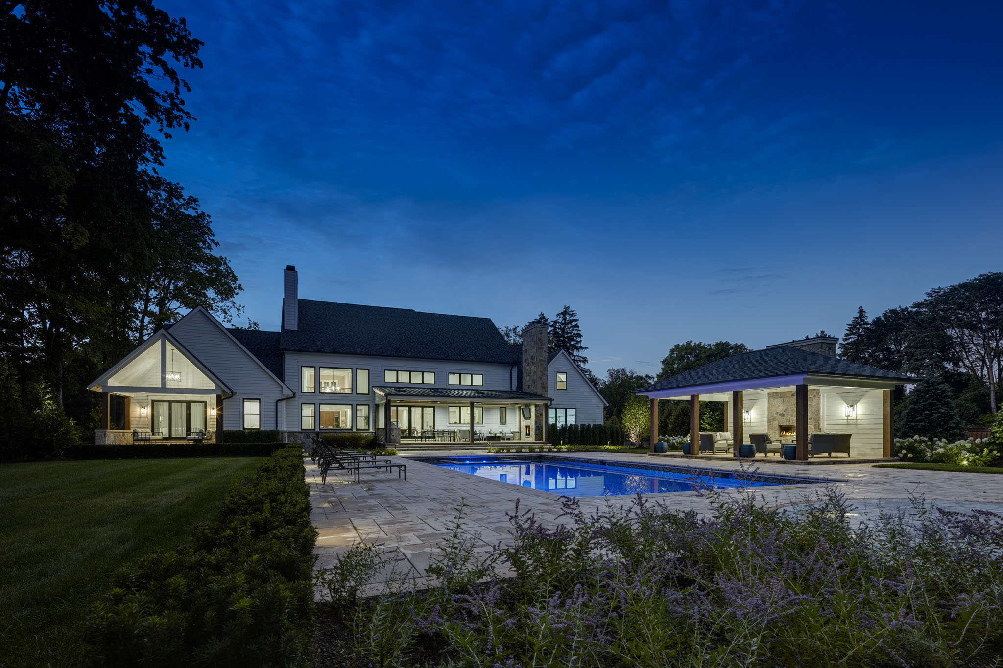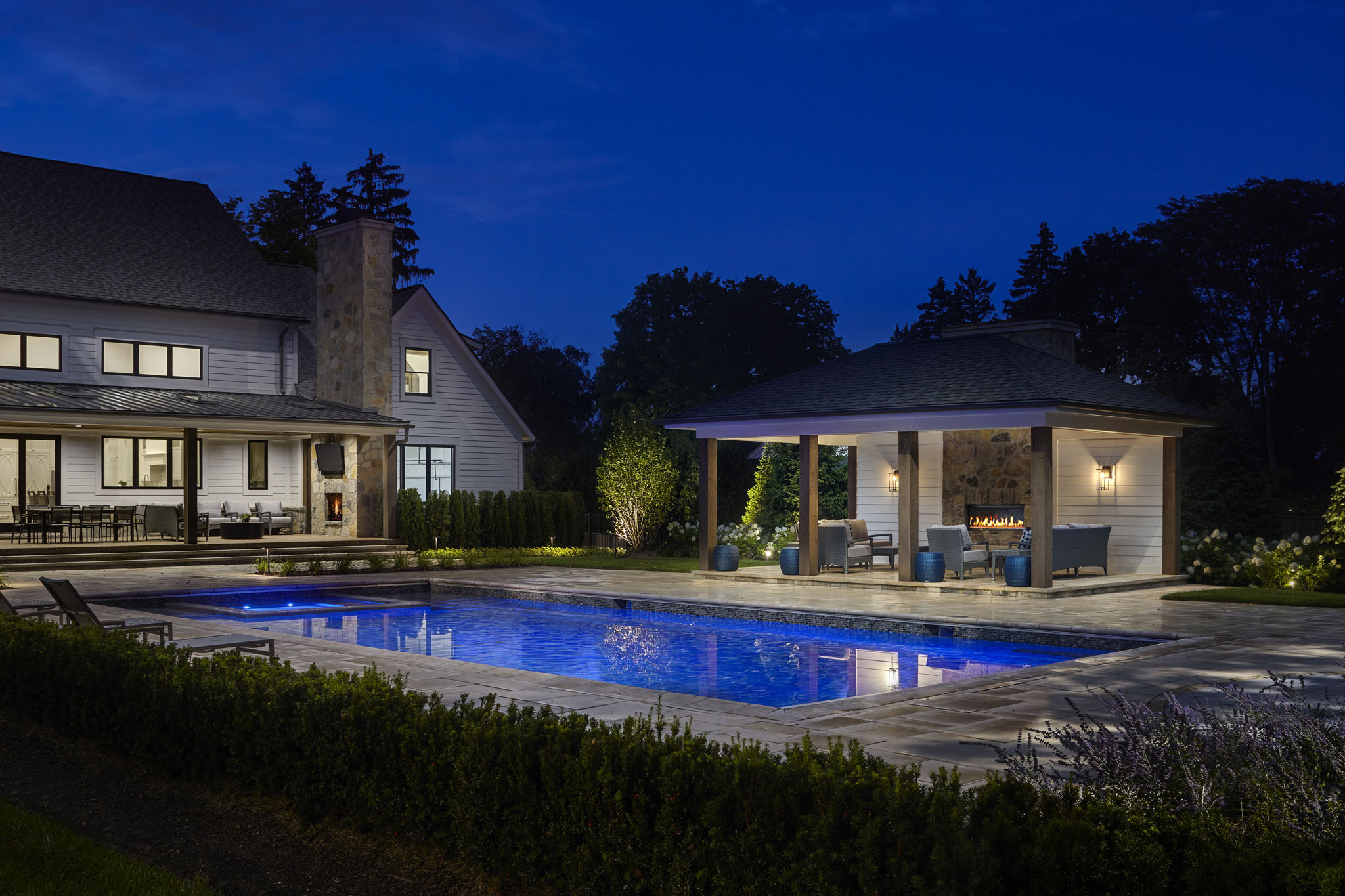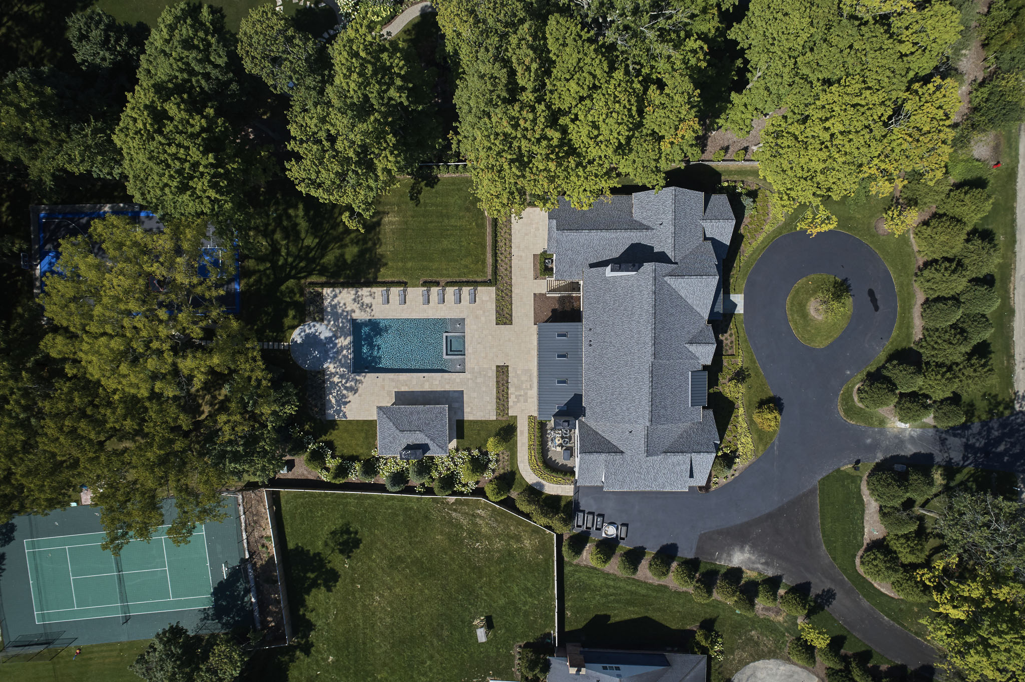 This estate home’s outdoor design is a seamless blend of luxury and functionality, thoughtfully curated to enhance both beauty and livability. At its heart, a stunning pool shimmers under the sun, complemented by a sophisticated pool house that offers a private retreat for relaxation and entertaining. A covered lanai extends from the home, providing a shaded, open-air living space perfect for year-round enjoyment. Nearby, a well-integrated sports court adds an active element, balancing recreation with refined design. Tailored landscaping, featuring manicured hedges, sculptural trees, and seasonal blooms, frames the property, ensuring a polished yet inviting atmosphere that harmonizes with the estate’s grandeur.