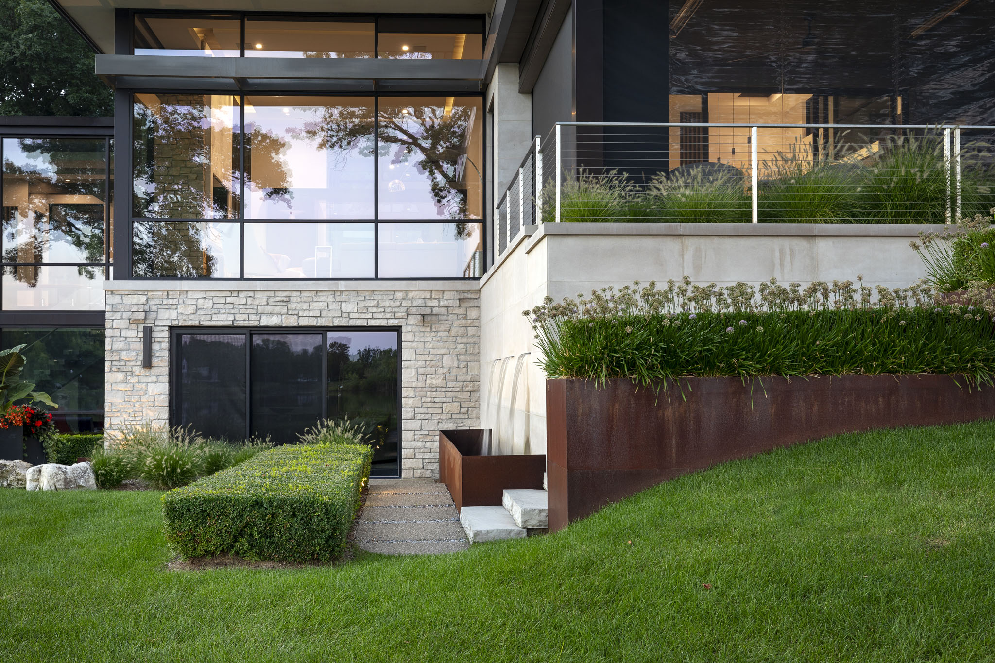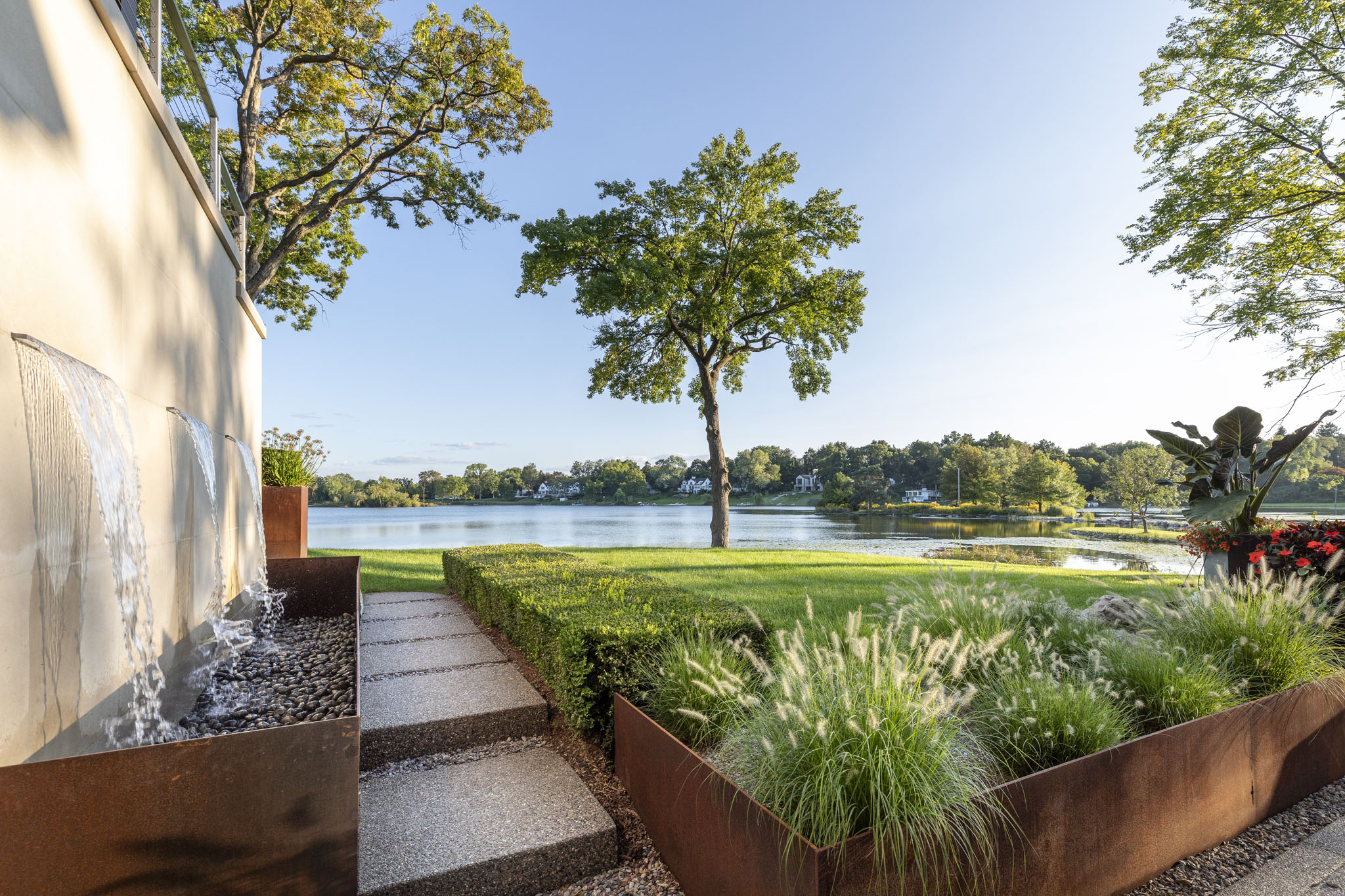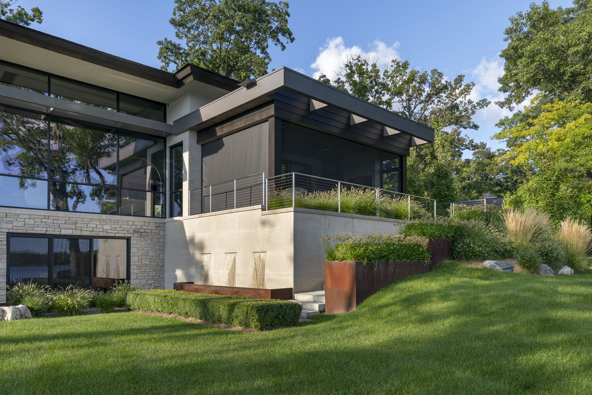 This thoughtfully designed lake home seamlessly blends natural beauty with refined outdoor living. Expansive patios and cozy seating areas are strategically placed to capture breathtaking water views, while soft plantings of native grasses and flowering perennials gently frame the space. A rolling lawn extends toward the shoreline, creating a sense of openness and tranquility. The material palette—warm stone, sleek metal, and raw concrete—adds depth and texture, complementing both the home’s architecture and the surrounding landscape. Every detail, from the carefully chosen finishes to the effortless flow between spaces, ensures a harmonious balance of elegance and nature.