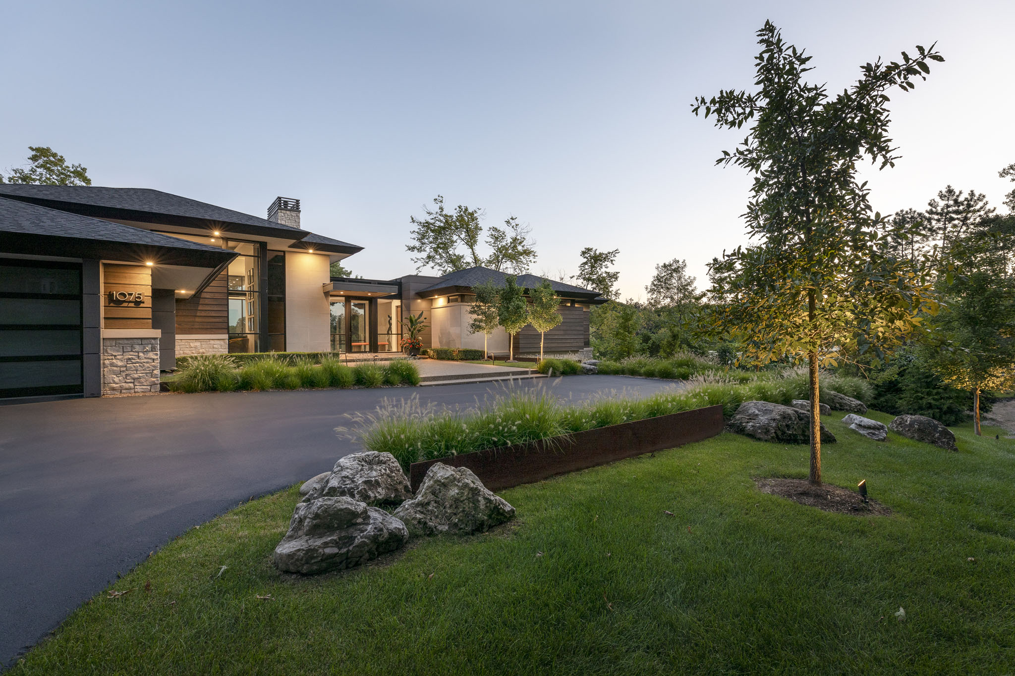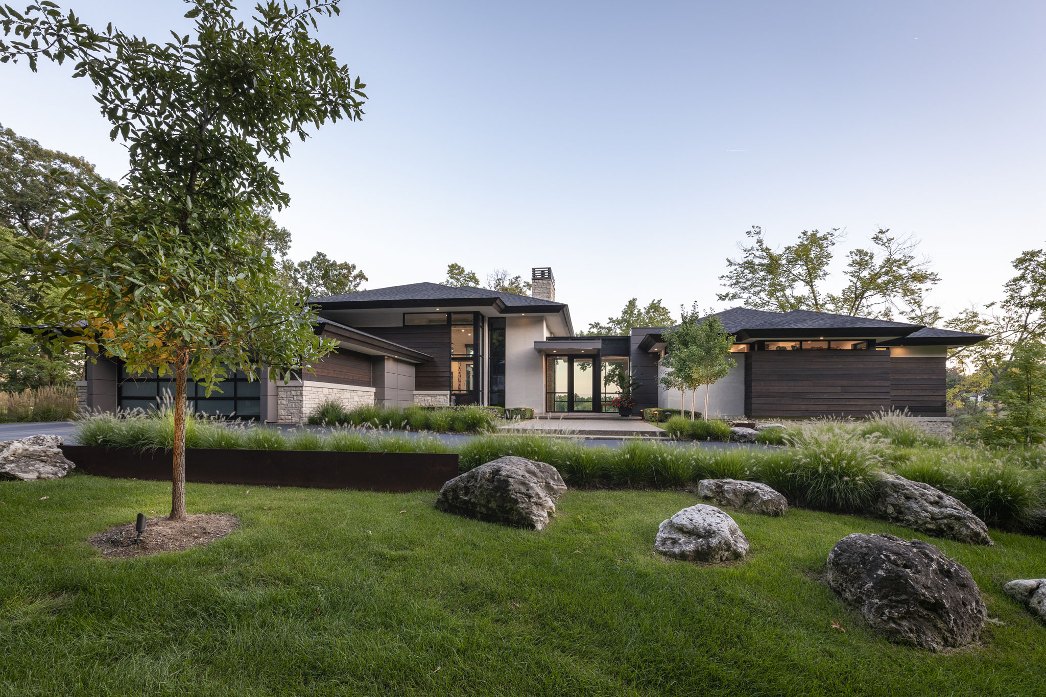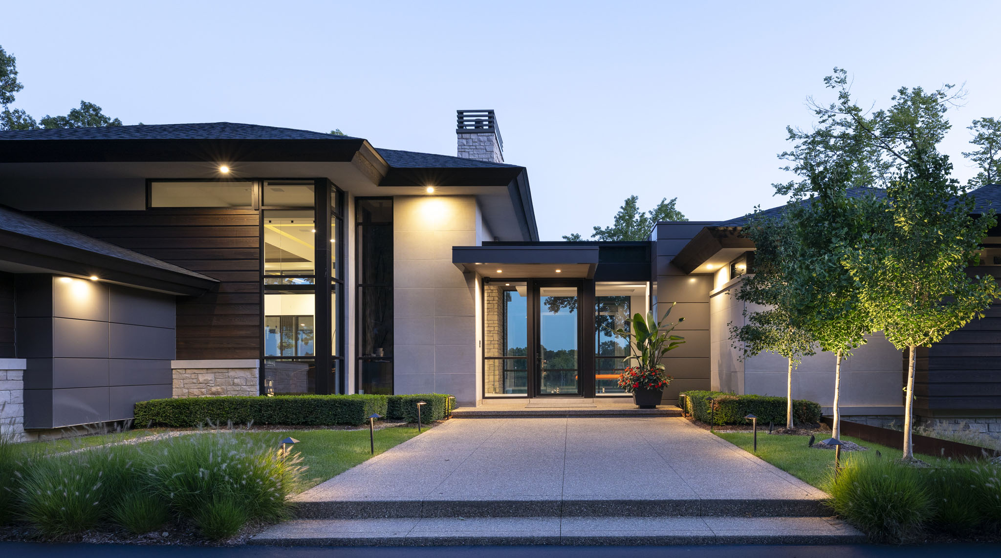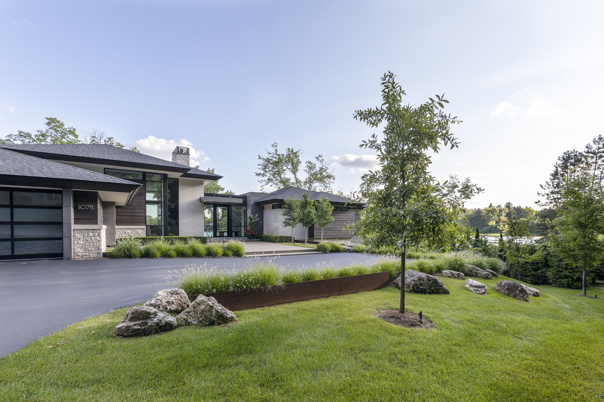 This thoughtfully designed lake home seamlessly blends natural beauty with refined outdoor living. Expansive patios and cozy seating areas are strategically placed to capture breathtaking water views, while soft plantings of native grasses and flowering perennials gently frame the space. A rolling lawn extends toward the shoreline, creating a sense of openness and tranquility. The material palette—warm stone, sleek metal, and raw concrete—adds depth and texture, complementing both the home’s architecture and the surrounding landscape. Every detail, from the carefully chosen finishes to the effortless flow between spaces, ensures a harmonious balance of elegance and nature.
